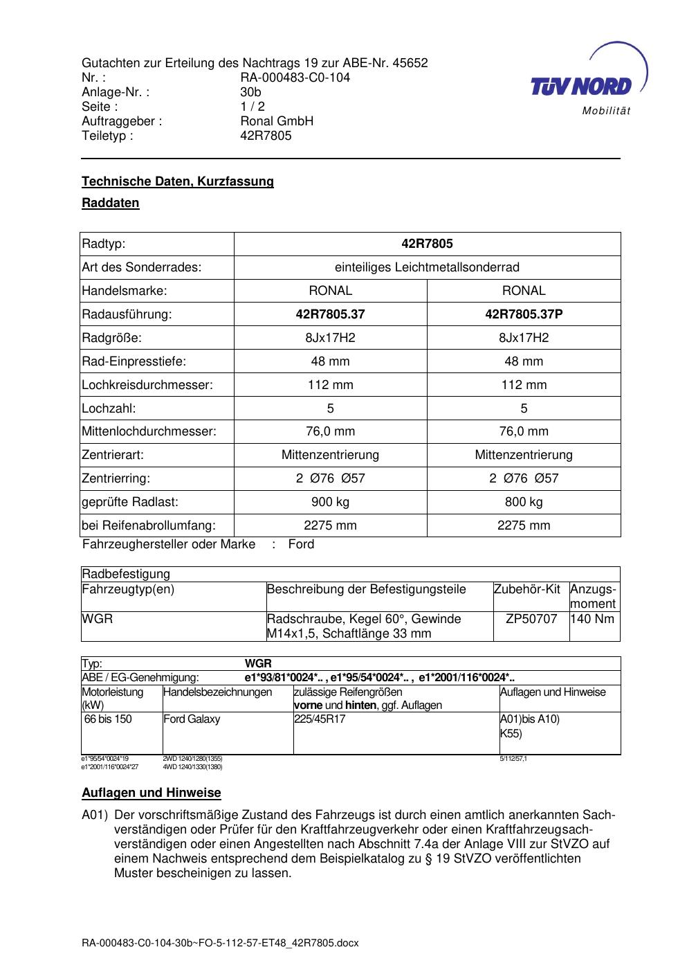 Dieses Gutachten (abe) bezieht sich auf die Alufelge brand-ronal 42R7805 in der Ausführung 8Jx17 ET 0, Mittenloch 0 mm (KBA 45652). Im PDF findest du typischerweise zulässige Reifengrößen, Auflagen/Anbauhinweise und – je nach Dokument – Hinweise zur Eintragung.
