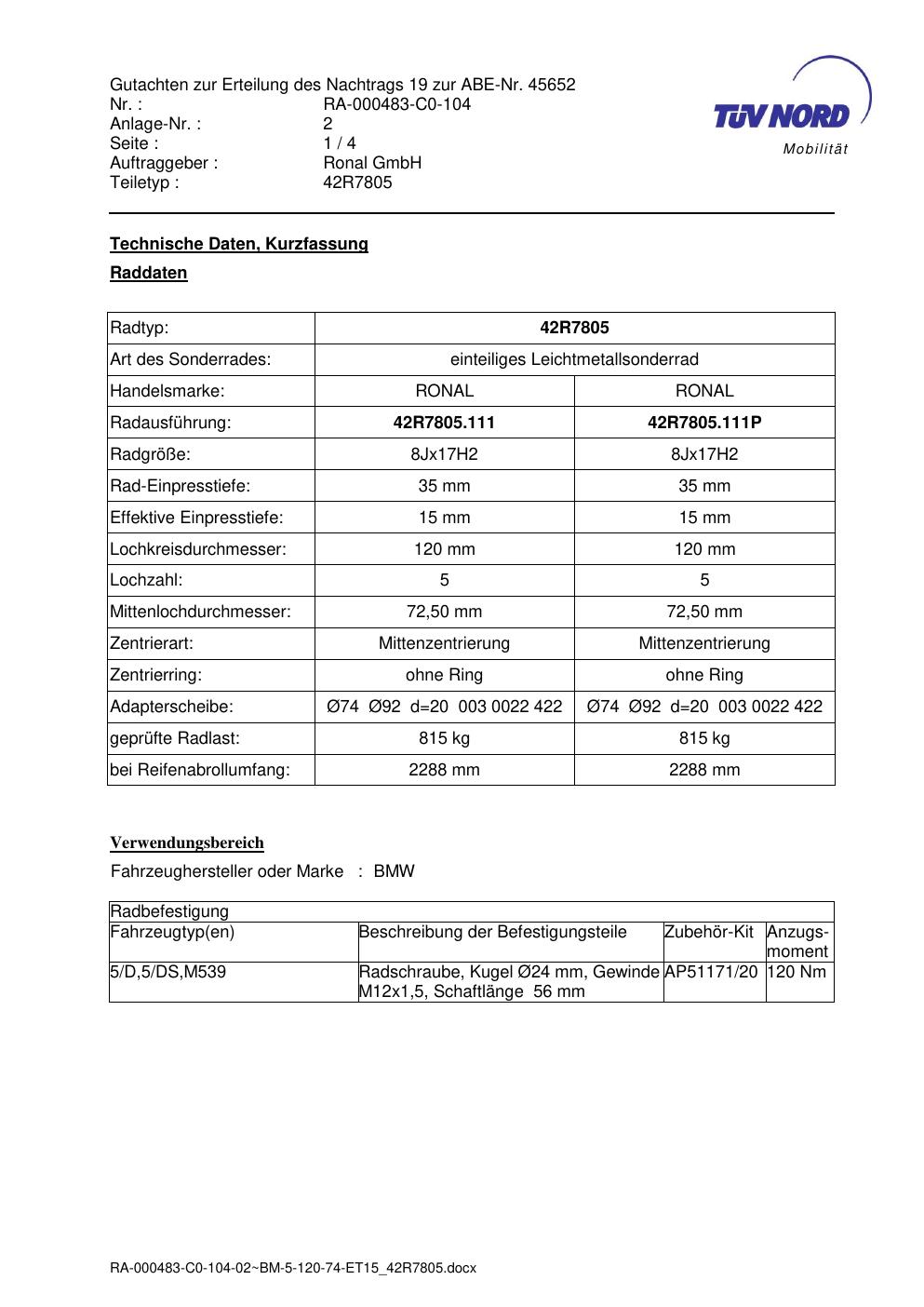 Dieses Gutachten (abe) bezieht sich auf die Alufelge brand-ronal 42R7805 in der Ausführung 8Jx17 ET 0, Mittenloch 0 mm (KBA 45652). Im PDF findest du typischerweise zulässige Reifengrößen, Auflagen/Anbauhinweise und – je nach Dokument – Hinweise zur Eintragung.
