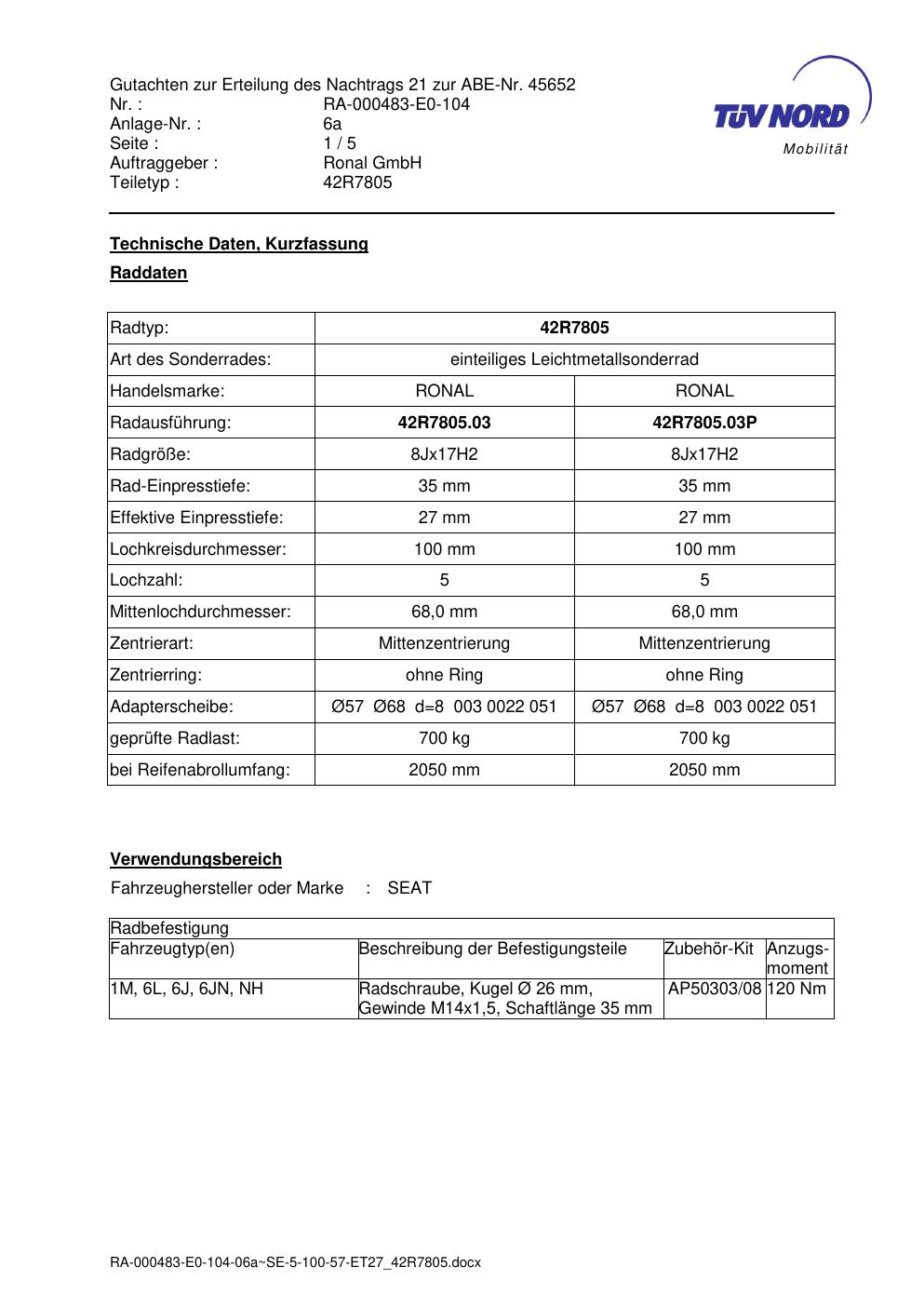 Dieses Gutachten (abe) bezieht sich auf die Alufelge brand-ronal 42R7805 in der Ausführung 8Jx17 ET 0, Mittenloch 0 mm (KBA 45652). Im PDF findest du typischerweise zulässige Reifengrößen, Auflagen/Anbauhinweise und – je nach Dokument – Hinweise zur Eintragung.