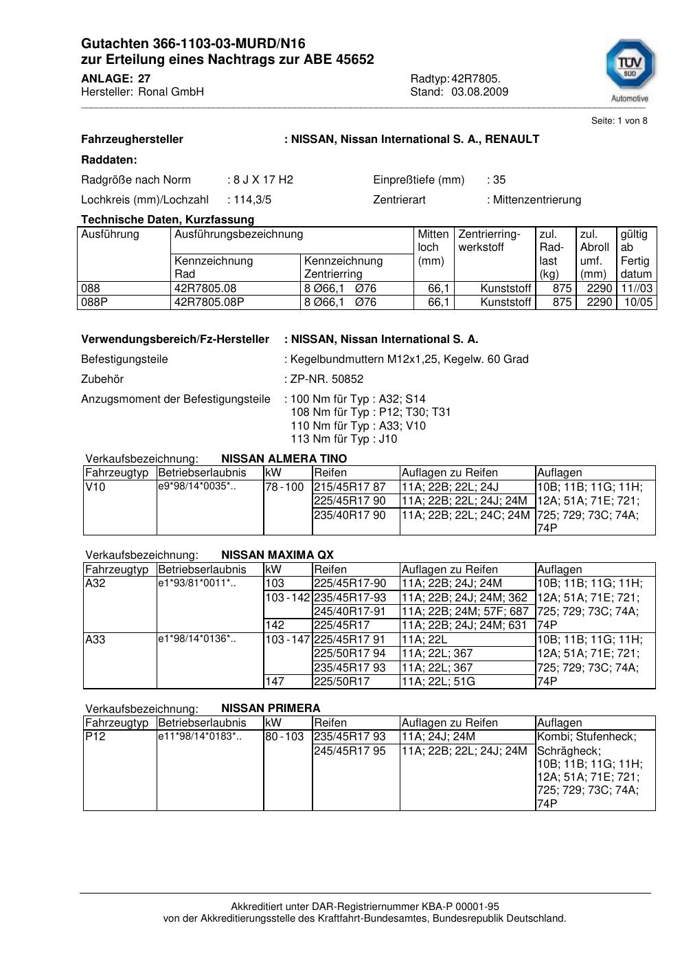 Dieses Gutachten (abe) bezieht sich auf die Alufelge Ronal 42R7805 in der Ausführung 8Jx17 ET 0, Mittenloch 0 mm (KBA 45652). Im PDF findest du typischerweise zulässige Reifengrößen, Auflagen/Anbauhinweise und – je nach Dokument – Hinweise zur Eintragung.