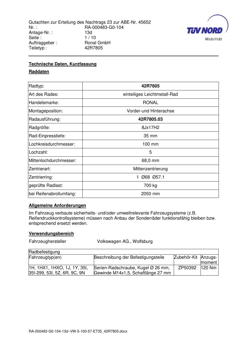 Dieses Gutachten (abe) bezieht sich auf die Alufelge brand-ronal 42R7805 in der Ausführung 8Jx17 ET 0, Mittenloch 0 mm (KBA 45652). Im PDF findest du typischerweise zulässige Reifengrößen, Auflagen/Anbauhinweise und – je nach Dokument – Hinweise zur Eintragung.
