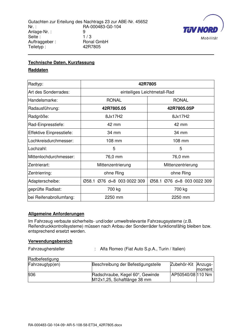 Dieses Gutachten (abe) bezieht sich auf die Alufelge brand-ronal 42R7805 in der Ausführung 8Jx17 ET 0, Mittenloch 0 mm (KBA 45652). Im PDF findest du typischerweise zulässige Reifengrößen, Auflagen/Anbauhinweise und – je nach Dokument – Hinweise zur Eintragung.