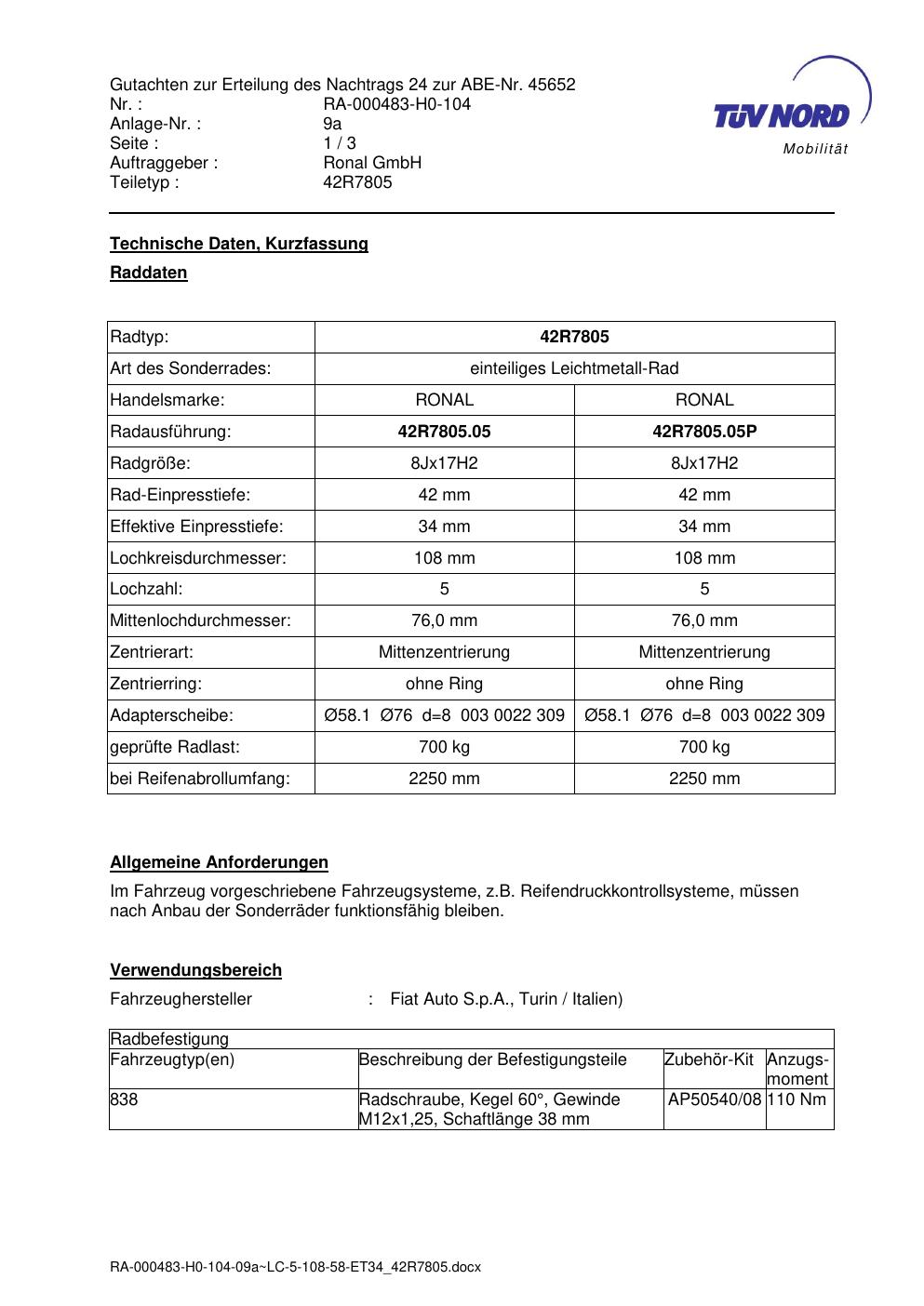 Dieses Gutachten (abe) bezieht sich auf die Alufelge brand-ronal 42R7805 in der Ausführung 8Jx17 ET 0, Mittenloch 0 mm (KBA 45652). Im PDF findest du typischerweise zulässige Reifengrößen, Auflagen/Anbauhinweise und – je nach Dokument – Hinweise zur Eintragung.