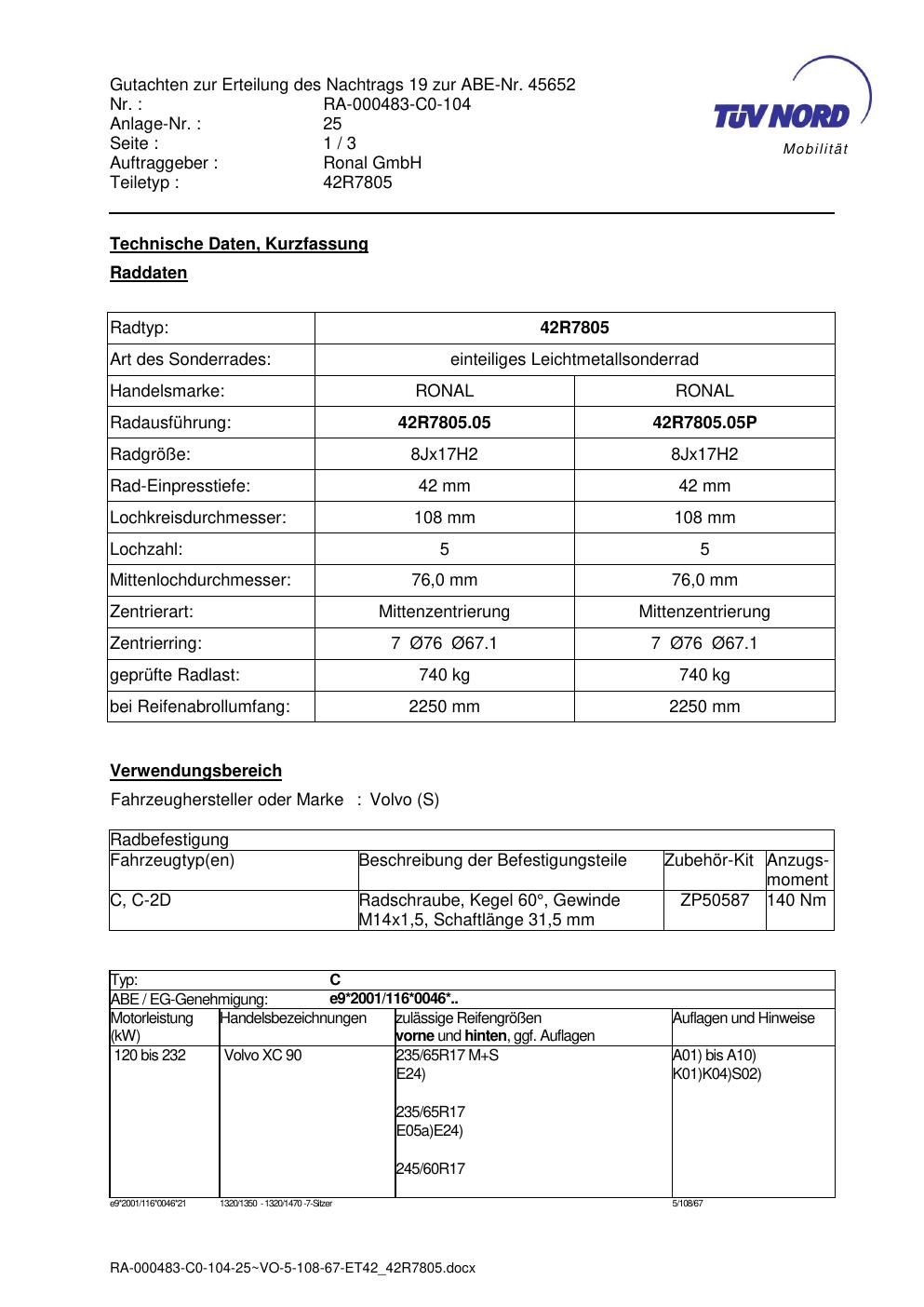 Dieses Gutachten (abe) bezieht sich auf die Alufelge brand-ronal 42R7805 in der Ausführung 8Jx17 ET 0, Mittenloch 0 mm (KBA 45652). Im PDF findest du typischerweise zulässige Reifengrößen, Auflagen/Anbauhinweise und – je nach Dokument – Hinweise zur Eintragung.