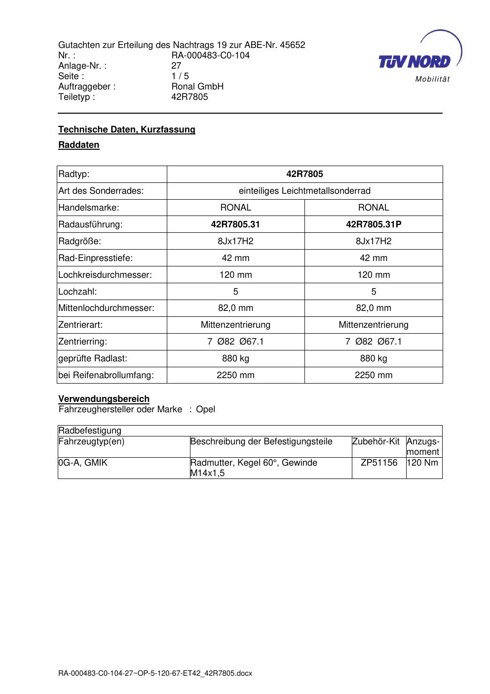 Dieses Gutachten (abe) bezieht sich auf die Alufelge brand-ronal 42R7805 in der Ausführung 8Jx17 ET 0, Mittenloch 0 mm (KBA 45652). Im PDF findest du typischerweise zulässige Reifengrößen, Auflagen/Anbauhinweise und – je nach Dokument – Hinweise zur Eintragung.