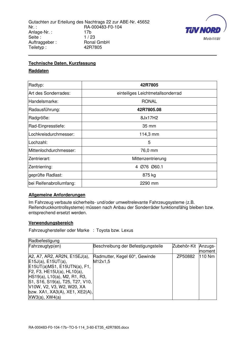 Dieses Gutachten (abe) bezieht sich auf die Alufelge brand-ronal 42R7805 in der Ausführung 8Jx17 ET 0, Mittenloch 0 mm (KBA 45652). Im PDF findest du typischerweise zulässige Reifengrößen, Auflagen/Anbauhinweise und – je nach Dokument – Hinweise zur Eintragung.