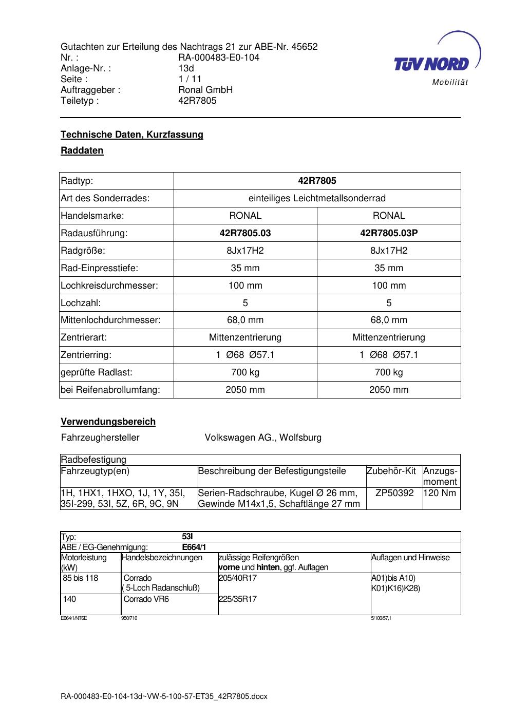 Dieses Gutachten (abe) bezieht sich auf die Alufelge brand-ronal 42R7805 in der Ausführung 8Jx17 ET 0, Mittenloch 0 mm (KBA 45652). Im PDF findest du typischerweise zulässige Reifengrößen, Auflagen/Anbauhinweise und – je nach Dokument – Hinweise zur Eintragung.