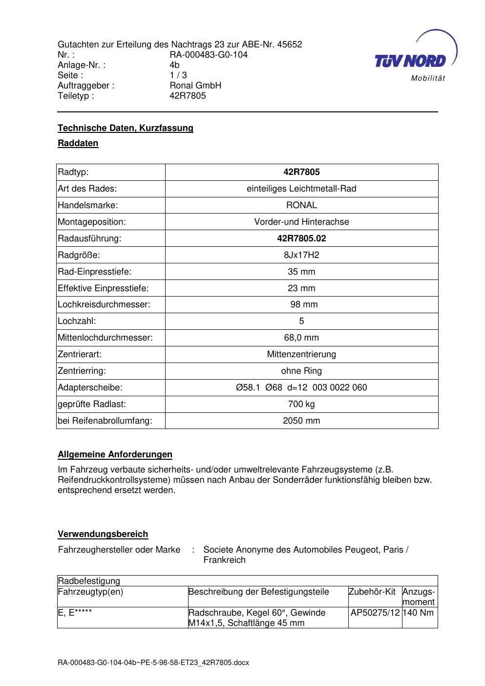 Dieses Gutachten (abe) bezieht sich auf die Alufelge brand-ronal 42R7805 in der Ausführung 8Jx17 ET 0, Mittenloch 0 mm (KBA 45652). Im PDF findest du typischerweise zulässige Reifengrößen, Auflagen/Anbauhinweise und – je nach Dokument – Hinweise zur Eintragung.