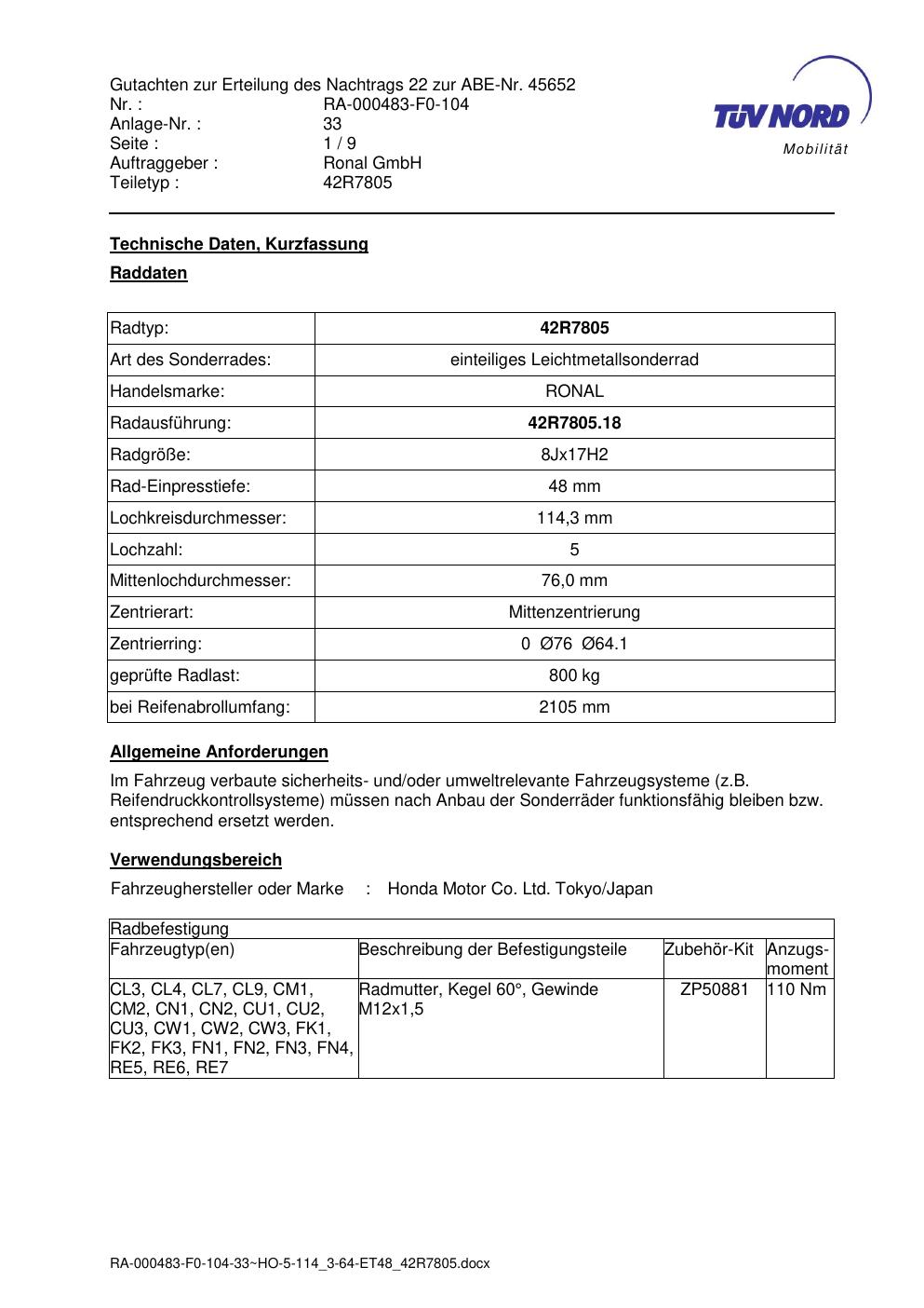 Dieses Gutachten (abe) bezieht sich auf die Alufelge brand-ronal 42R7805 in der Ausführung 8Jx17 ET 0, Mittenloch 0 mm (KBA 45652). Im PDF findest du typischerweise zulässige Reifengrößen, Auflagen/Anbauhinweise und – je nach Dokument – Hinweise zur Eintragung.