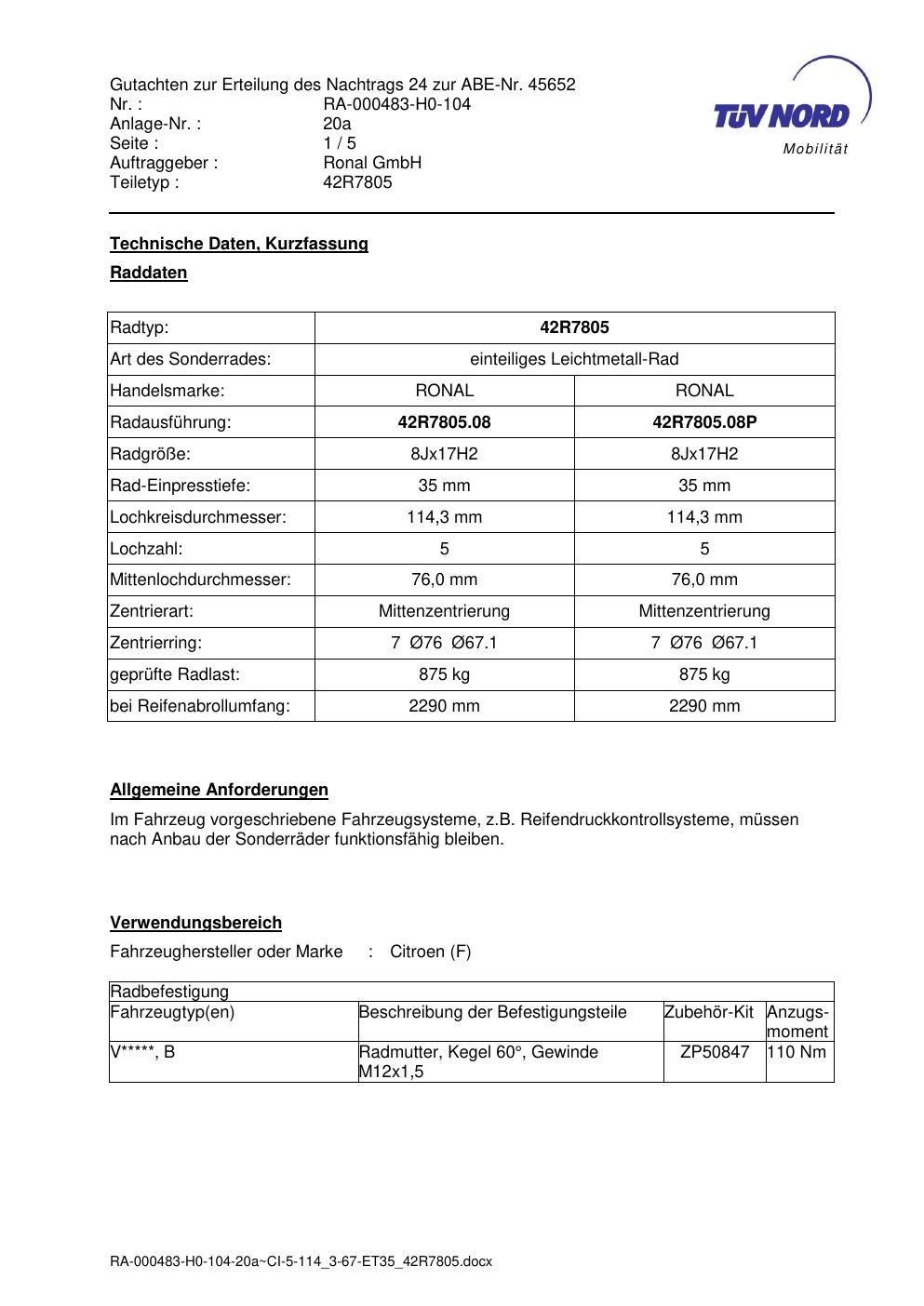Dieses Gutachten (abe) bezieht sich auf die Alufelge brand-ronal 42R7805 in der Ausführung 8Jx17 ET 0, Mittenloch 0 mm (KBA 45652). Im PDF findest du typischerweise zulässige Reifengrößen, Auflagen/Anbauhinweise und – je nach Dokument – Hinweise zur Eintragung.
