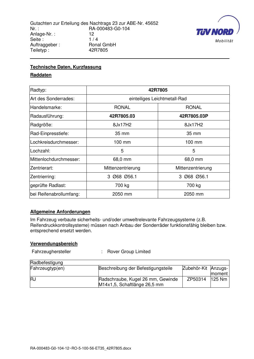 Dieses Gutachten (abe) bezieht sich auf die Alufelge brand-ronal 42R7805 in der Ausführung 8Jx17 ET 0, Mittenloch 0 mm (KBA 45652). Im PDF findest du typischerweise zulässige Reifengrößen, Auflagen/Anbauhinweise und – je nach Dokument – Hinweise zur Eintragung.
