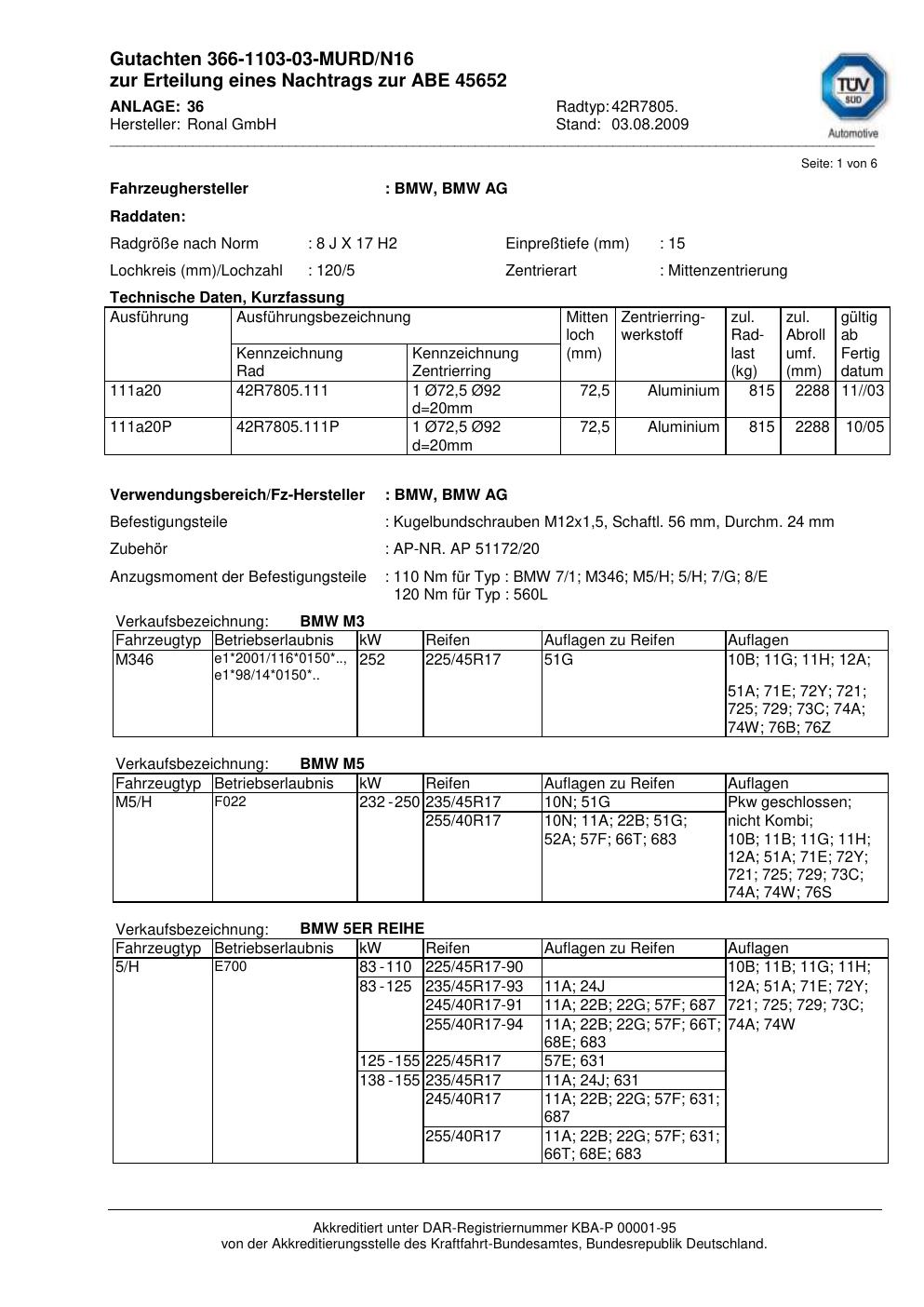 Dieses Gutachten (abe) bezieht sich auf die Alufelge brand-ronal 42R7805 in der Ausführung 8Jx17 ET 0, Mittenloch 0 mm (KBA 45652). Im PDF findest du typischerweise zulässige Reifengrößen, Auflagen/Anbauhinweise und – je nach Dokument – Hinweise zur Eintragung.