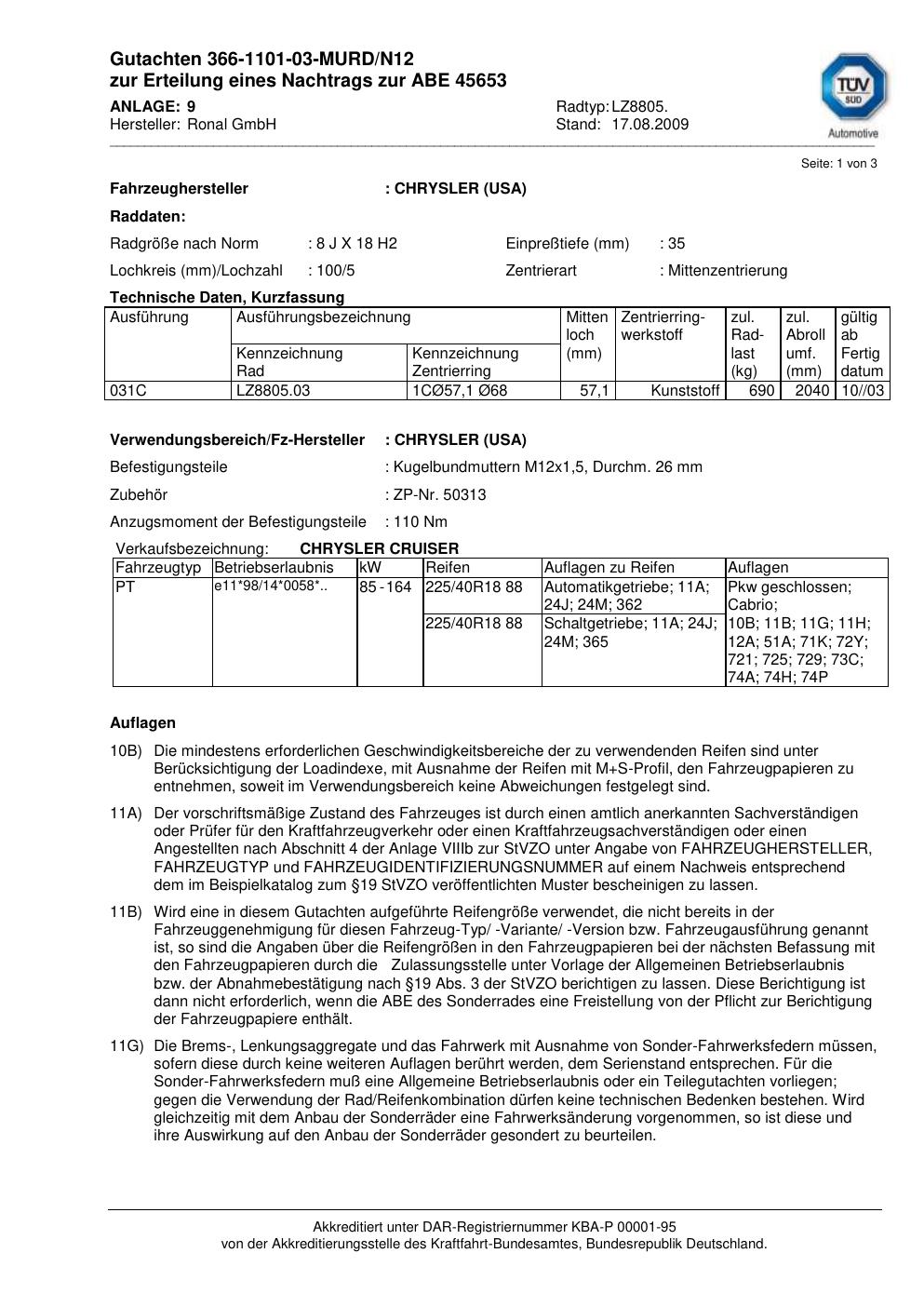 Dieses Gutachten (abe) bezieht sich auf die Alufelge Ronal LZ8805 in der Ausführung 8Jx18 ET 0, Mittenloch 0 mm (KBA 45653). Im PDF findest du typischerweise zulässige Reifengrößen, Auflagen/Anbauhinweise und – je nach Dokument – Hinweise zur Eintragung.