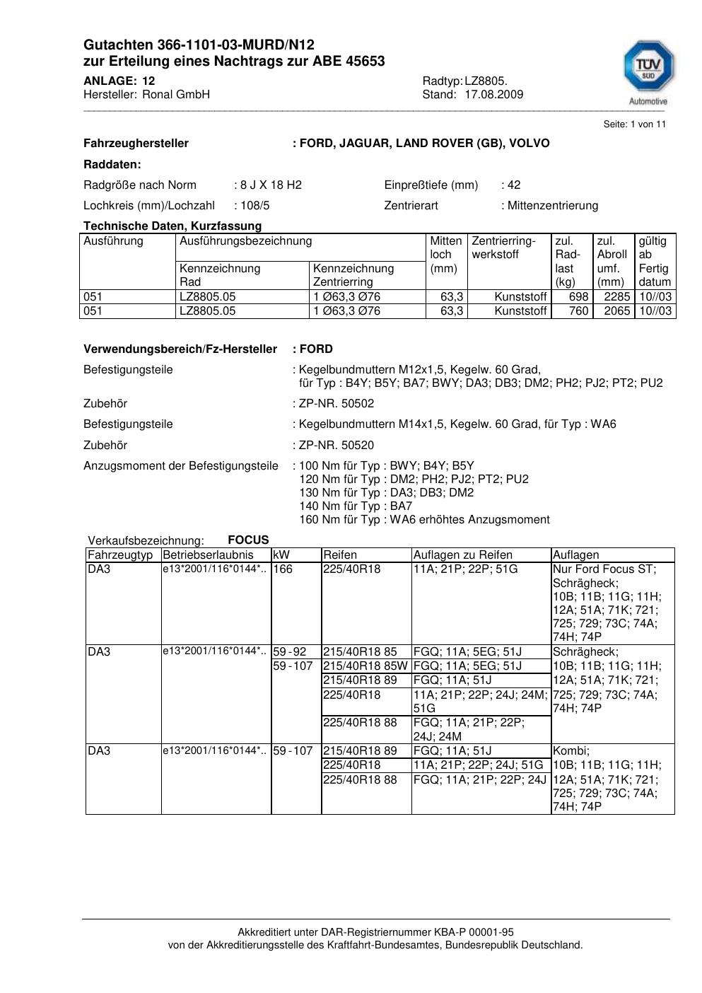Dieses Gutachten (abe) bezieht sich auf die Alufelge Ronal LZ8805 in der Ausführung 8Jx18 ET 0, Mittenloch 0 mm (KBA 45653). Im PDF findest du typischerweise zulässige Reifengrößen, Auflagen/Anbauhinweise und – je nach Dokument – Hinweise zur Eintragung.
