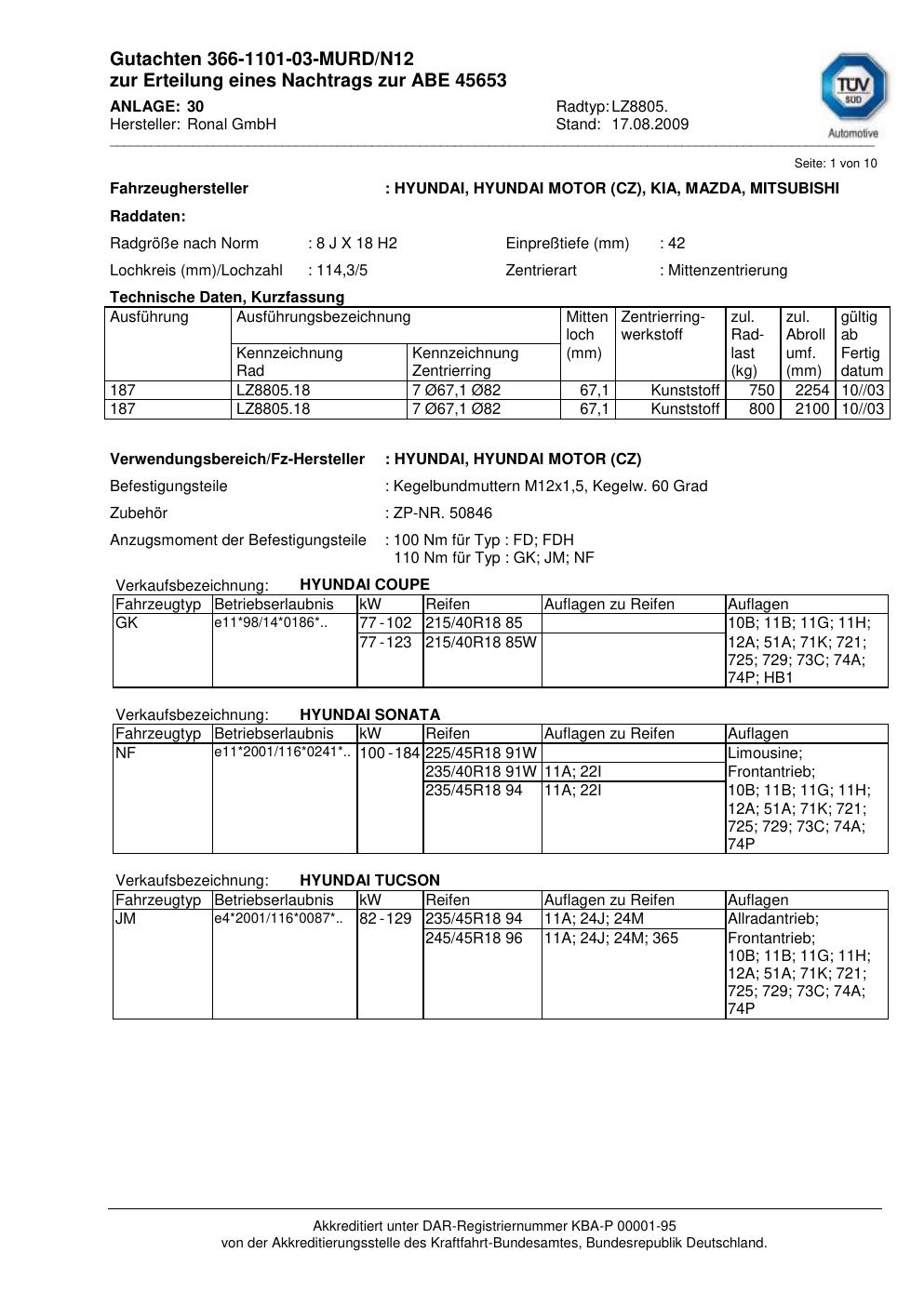 Dieses Gutachten (abe) bezieht sich auf die Alufelge Ronal LZ8805 in der Ausführung 8Jx18 ET 0, Mittenloch 0 mm (KBA 45653). Im PDF findest du typischerweise zulässige Reifengrößen, Auflagen/Anbauhinweise und – je nach Dokument – Hinweise zur Eintragung.