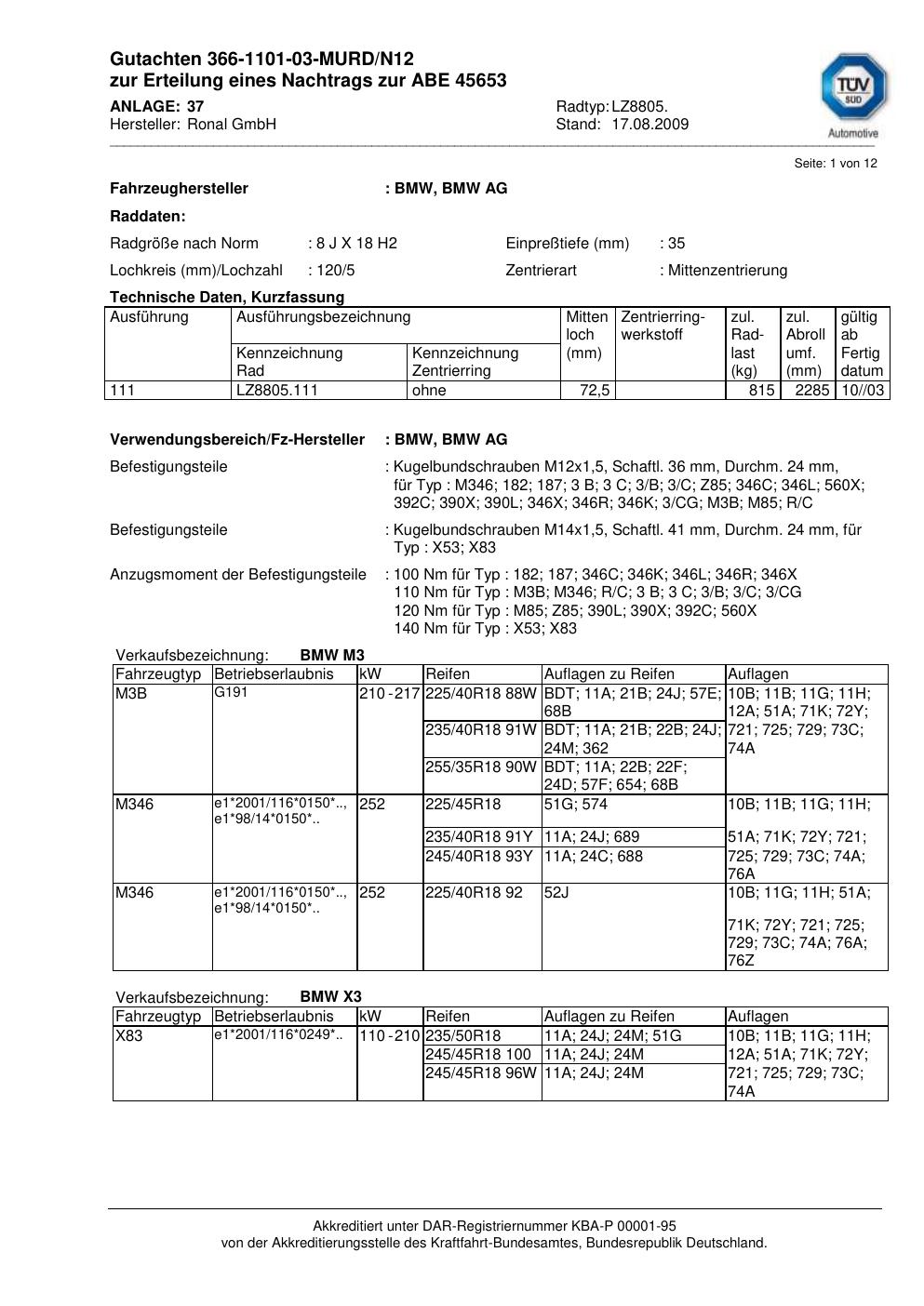 Dieses Gutachten (abe) bezieht sich auf die Alufelge Ronal LZ8805 in der Ausführung 8Jx18 ET 0, Mittenloch 0 mm (KBA 45653). Im PDF findest du typischerweise zulässige Reifengrößen, Auflagen/Anbauhinweise und – je nach Dokument – Hinweise zur Eintragung.
