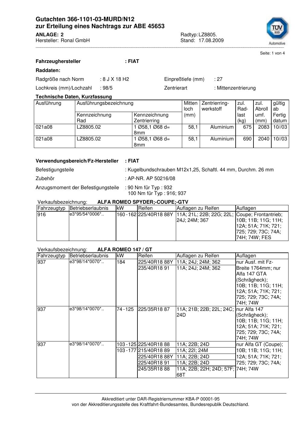 Dieses Gutachten (abe) bezieht sich auf die Alufelge Ronal LZ8805 in der Ausführung 8Jx18 ET 0, Mittenloch 0 mm (KBA 45653). Im PDF findest du typischerweise zulässige Reifengrößen, Auflagen/Anbauhinweise und – je nach Dokument – Hinweise zur Eintragung.