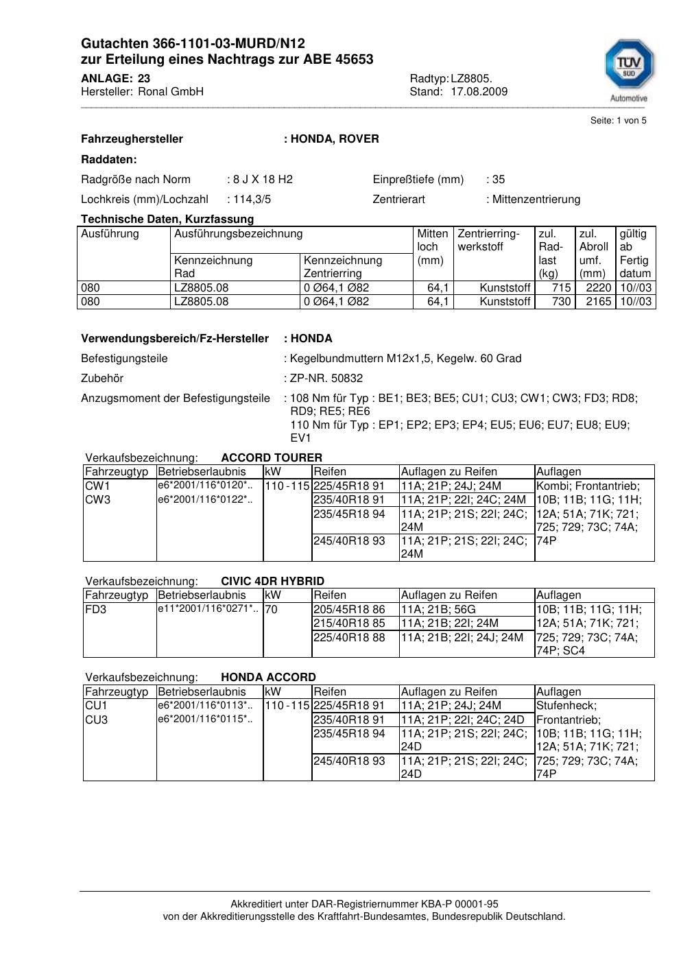 Dieses Gutachten (abe) bezieht sich auf die Alufelge Ronal LZ8805 in der Ausführung 8Jx18 ET 0, Mittenloch 0 mm (KBA 45653). Im PDF findest du typischerweise zulässige Reifengrößen, Auflagen/Anbauhinweise und – je nach Dokument – Hinweise zur Eintragung.