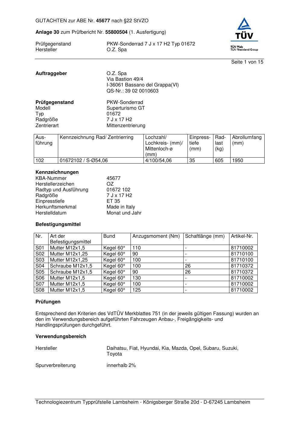 Dieses Gutachten (abe) bezieht sich auf die Alufelge ATS 01672 in der Ausführung 7Jx17 ET 0, Mittenloch 0 mm (KBA 45677). Im PDF findest du typischerweise zulässige Reifengrößen, Auflagen/Anbauhinweise und – je nach Dokument – Hinweise zur Eintragung.