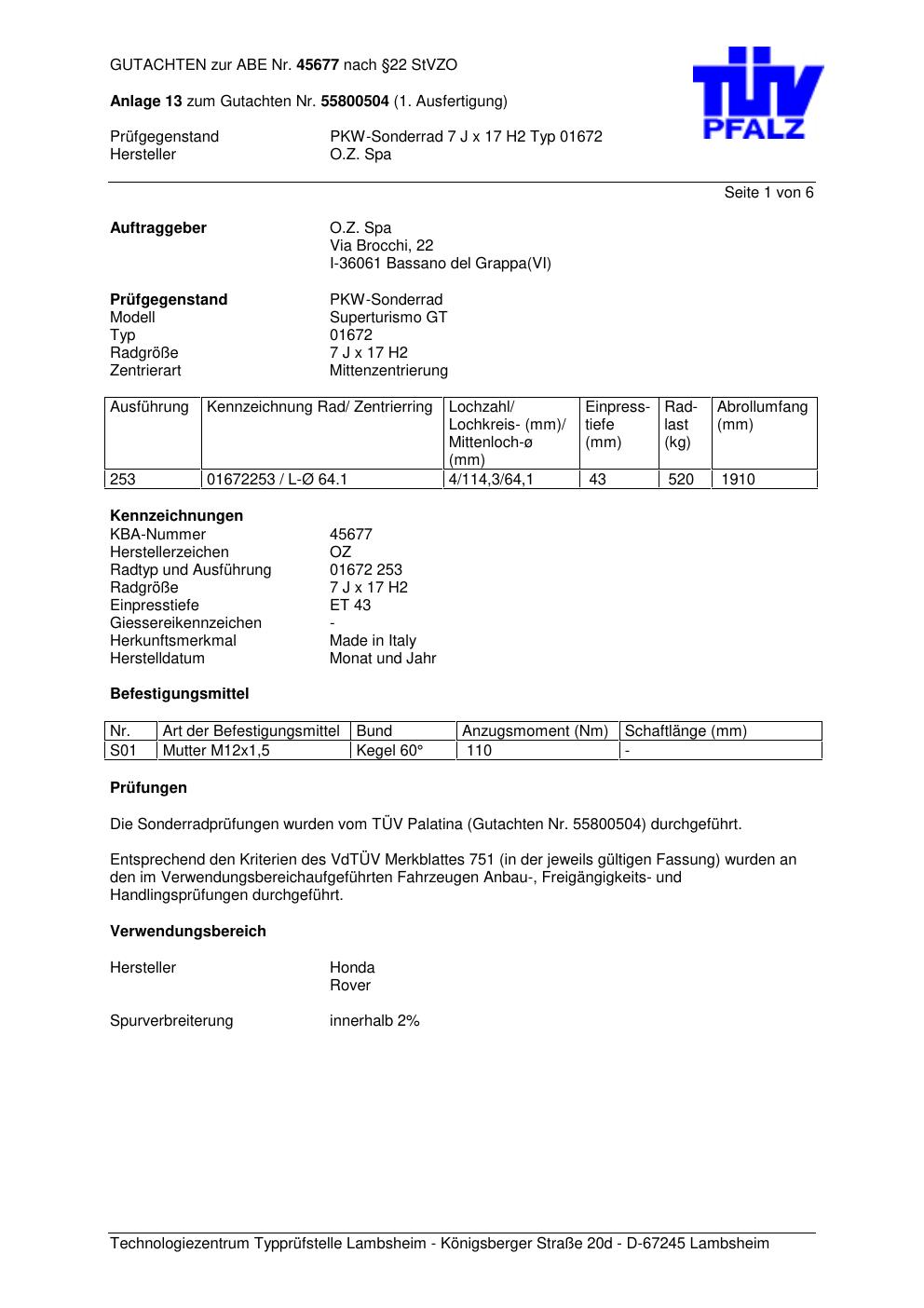 Dieses Gutachten (abe) bezieht sich auf die Alufelge co-rod 01672 in der Ausführung 7Jx17 ET 0, Mittenloch 0 mm (KBA 45677). Im PDF findest du typischerweise zulässige Reifengrößen, Auflagen/Anbauhinweise und – je nach Dokument – Hinweise zur Eintragung.
