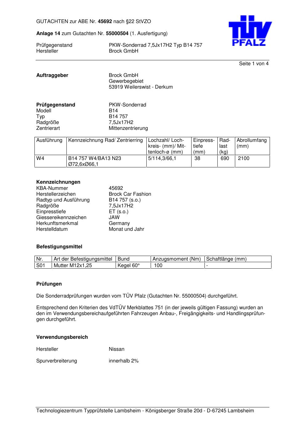 Dieses Gutachten (abe) bezieht sich auf die Alufelge Brock B14 757 in der Ausführung 7.5Jx17 ET 0, Mittenloch 0 mm (KBA 45692). Im PDF findest du typischerweise zulässige Reifengrößen, Auflagen/Anbauhinweise und – je nach Dokument – Hinweise zur Eintragung.