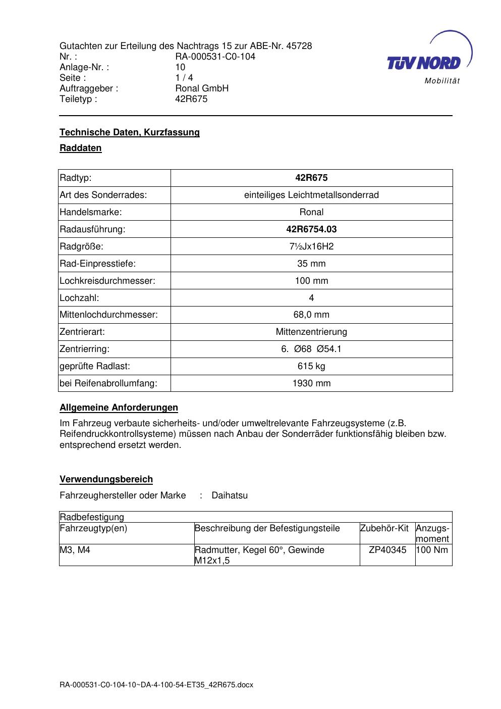 Dieses Gutachten (abe) bezieht sich auf die Alufelge ATS 42R675 in der Ausführung ET 0, Mittenloch 0 mm (KBA 45728). Im PDF findest du typischerweise zulässige Reifengrößen, Auflagen/Anbauhinweise und – je nach Dokument – Hinweise zur Eintragung.