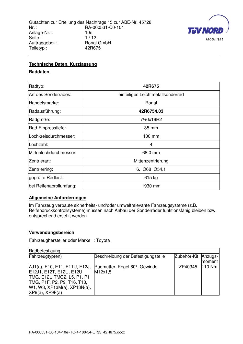 Dieses Gutachten (abe) bezieht sich auf die Alufelge ATS 42R675 in der Ausführung ET 0, Mittenloch 0 mm (KBA 45728). Im PDF findest du typischerweise zulässige Reifengrößen, Auflagen/Anbauhinweise und – je nach Dokument – Hinweise zur Eintragung.