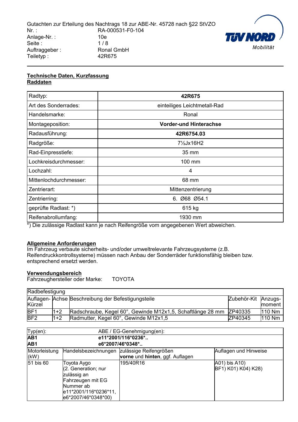 Dieses Gutachten (abe) bezieht sich auf die Alufelge ATS 42R675 in der Ausführung ET 0, Mittenloch 0 mm (KBA 45728). Im PDF findest du typischerweise zulässige Reifengrößen, Auflagen/Anbauhinweise und – je nach Dokument – Hinweise zur Eintragung.