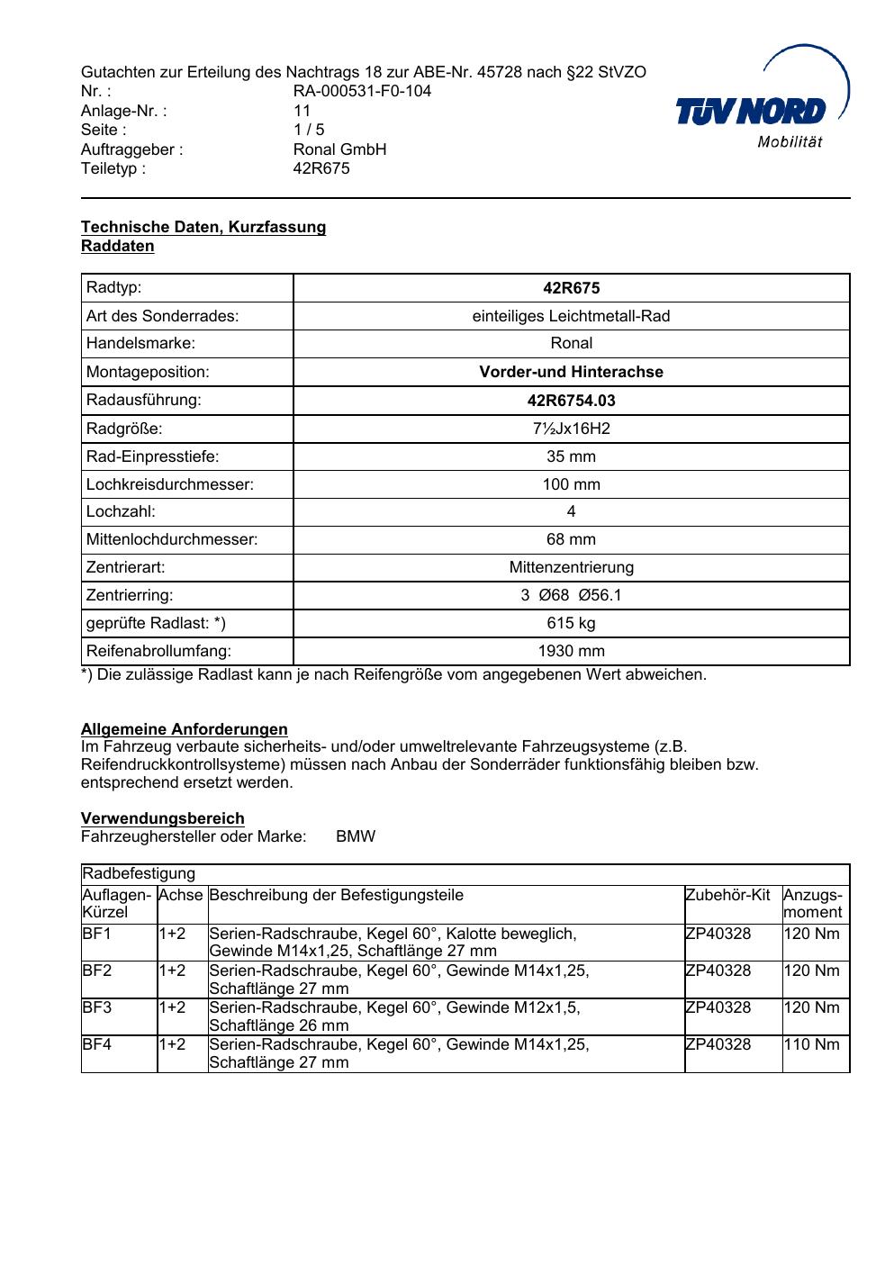 Dieses Gutachten (abe) bezieht sich auf die Alufelge Ronal 42R675 in der Ausführung ET 0, Mittenloch 0 mm (KBA 45728). Im PDF findest du typischerweise zulässige Reifengrößen, Auflagen/Anbauhinweise und – je nach Dokument – Hinweise zur Eintragung.
