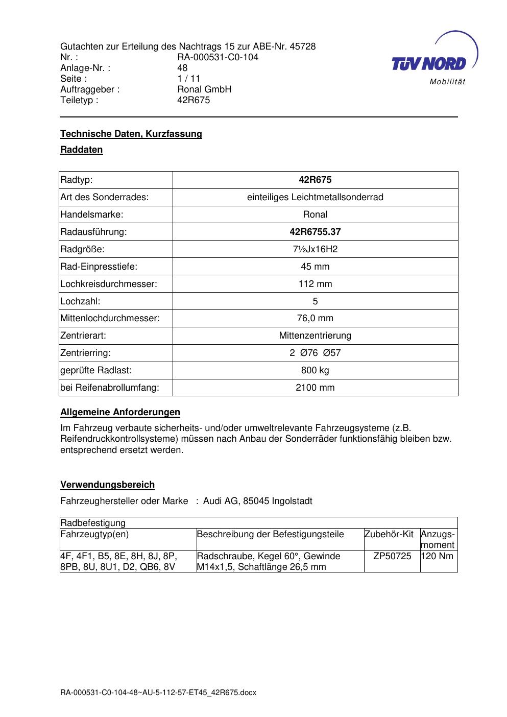 Dieses Gutachten (abe) bezieht sich auf die Alufelge Ronal 42R675 in der Ausführung 8Jx19 ET 0, Mittenloch 0 mm (KBA 45728). Im PDF findest du typischerweise zulässige Reifengrößen, Auflagen/Anbauhinweise und – je nach Dokument – Hinweise zur Eintragung.