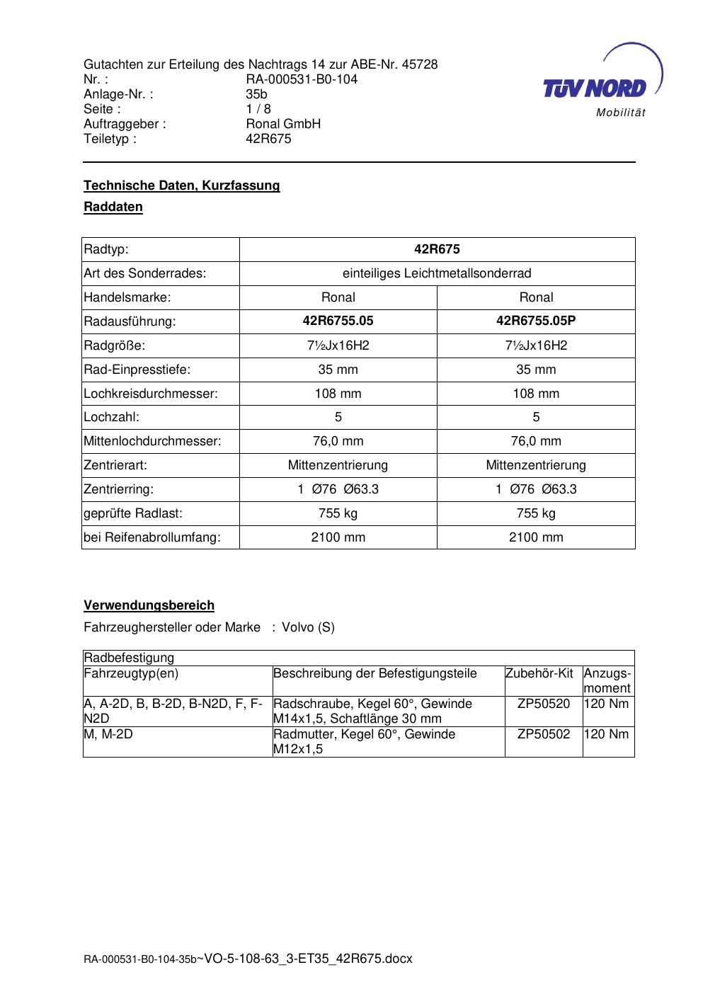 Dieses Gutachten (abe) bezieht sich auf die Alufelge Ronal 42R675 in der Ausführung ET 0, Mittenloch 0 mm (KBA 45728). Im PDF findest du typischerweise zulässige Reifengrößen, Auflagen/Anbauhinweise und – je nach Dokument – Hinweise zur Eintragung.