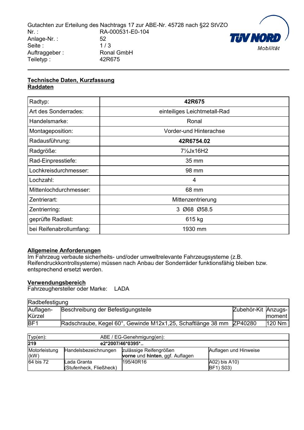 Dieses Gutachten (abe) bezieht sich auf die Alufelge Ronal 42R675 in der Ausführung ET 0, Mittenloch 0 mm (KBA 45728). Im PDF findest du typischerweise zulässige Reifengrößen, Auflagen/Anbauhinweise und – je nach Dokument – Hinweise zur Eintragung.