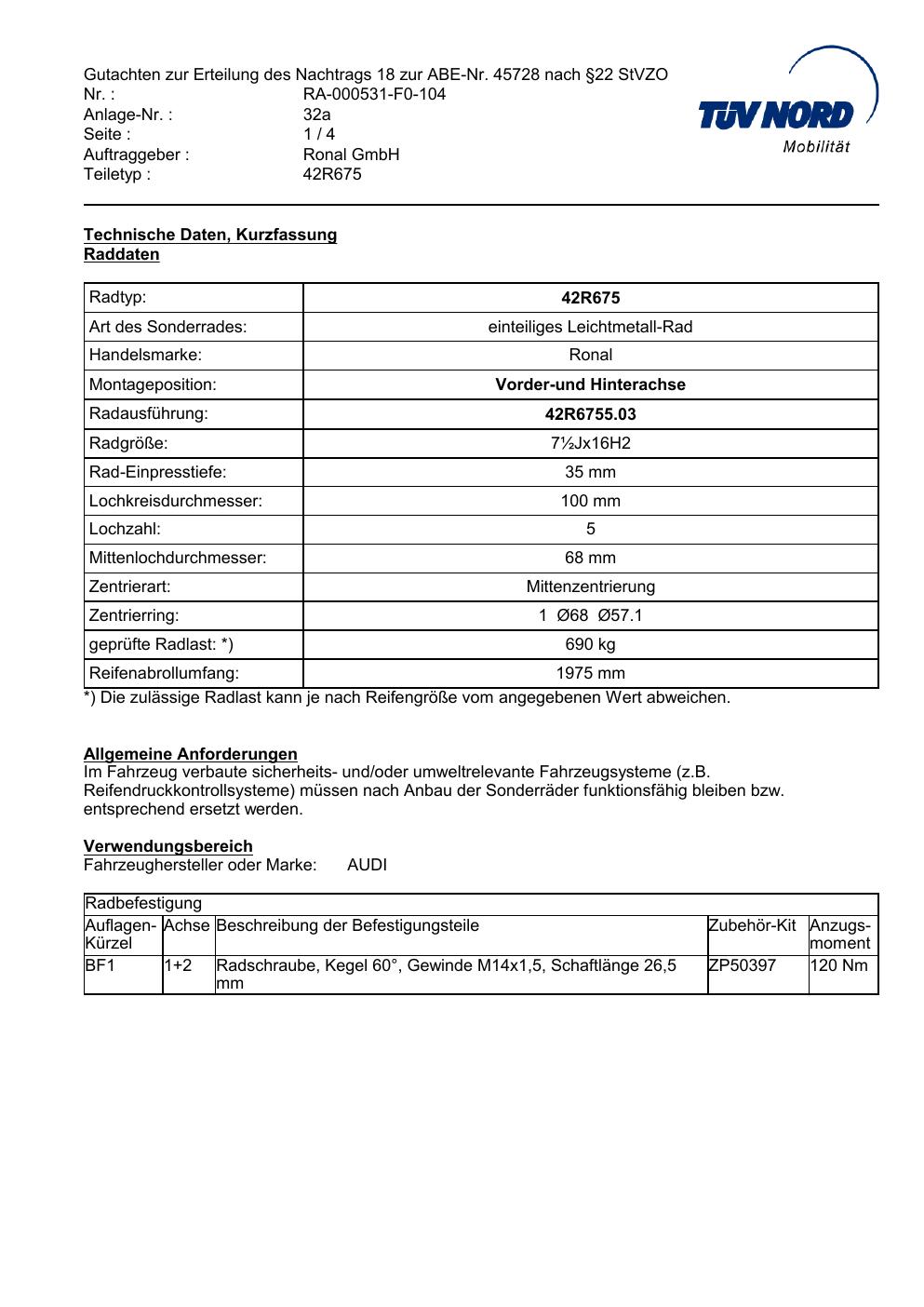 Dieses Gutachten (abe) bezieht sich auf die Alufelge Ronal 42R675 in der Ausführung ET 0, Mittenloch 0 mm (KBA 45728). Im PDF findest du typischerweise zulässige Reifengrößen, Auflagen/Anbauhinweise und – je nach Dokument – Hinweise zur Eintragung.