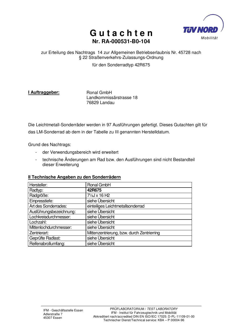 Dieses Gutachten (abe) bezieht sich auf die Alufelge Ronal 42R675 in der Ausführung ET 0, Mittenloch 0 mm (KBA 45728). Im PDF findest du typischerweise zulässige Reifengrößen, Auflagen/Anbauhinweise und – je nach Dokument – Hinweise zur Eintragung.