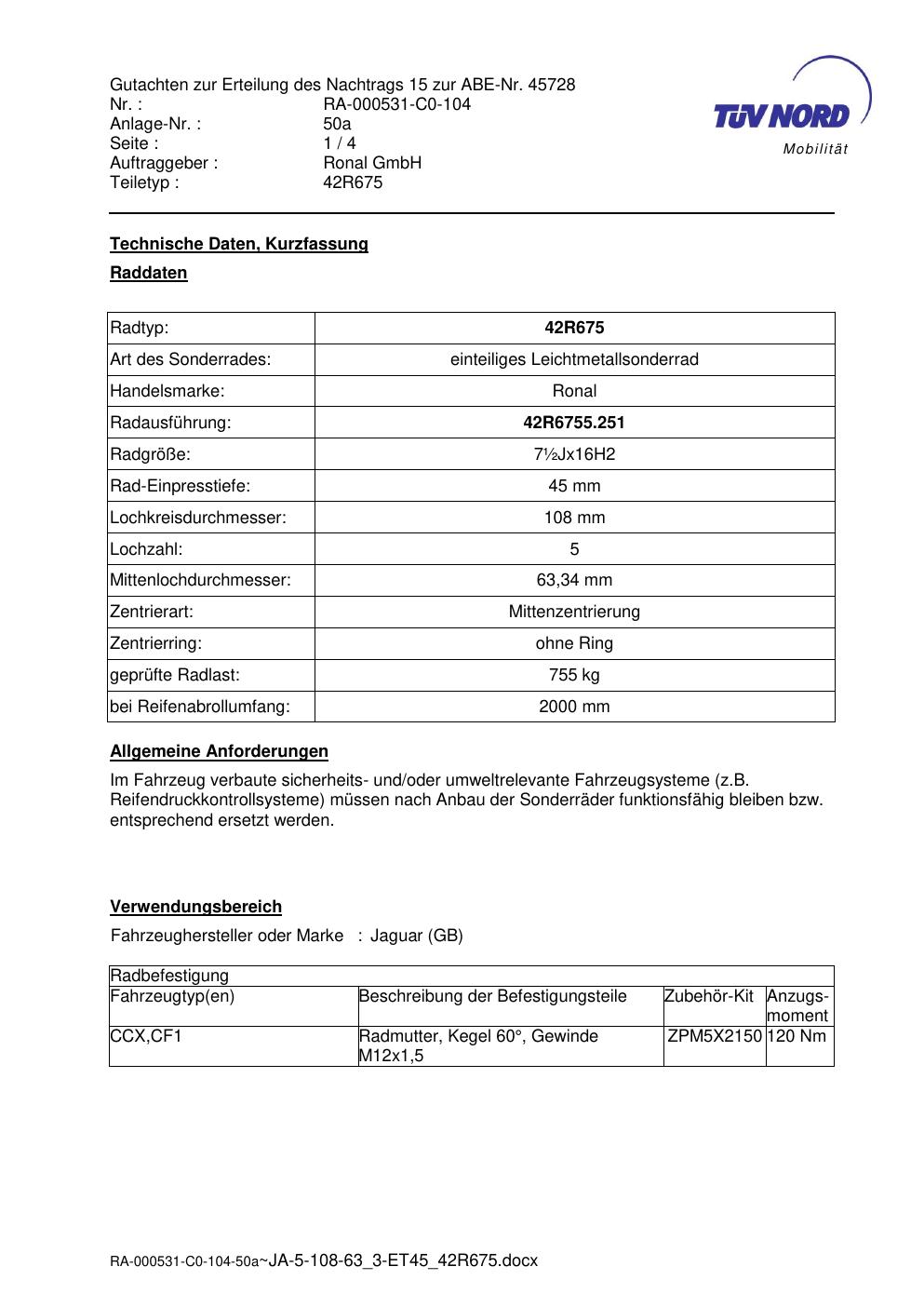 Prüfe, ob Marke und Serie (Ronal 42R675) wirklich zur gesuchten Felge passen.