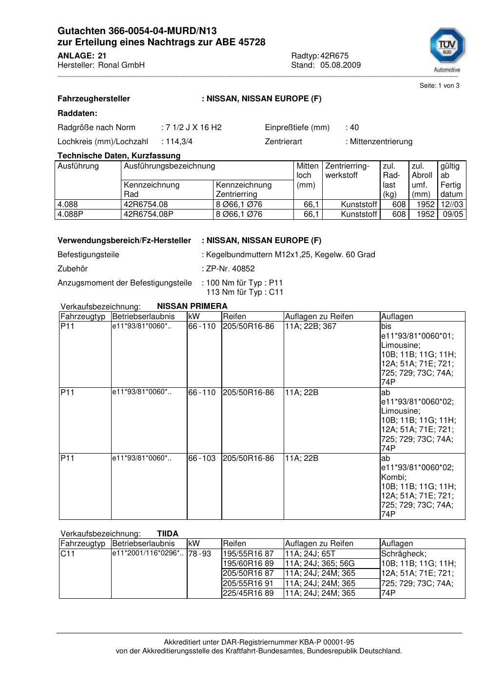 Dieses Gutachten (abe) bezieht sich auf die Alufelge Ronal 42R675 in der Ausführung 2Jx16 ET 0, Mittenloch 0 mm (KBA 45728). Im PDF findest du typischerweise zulässige Reifengrößen, Auflagen/Anbauhinweise und – je nach Dokument – Hinweise zur Eintragung.