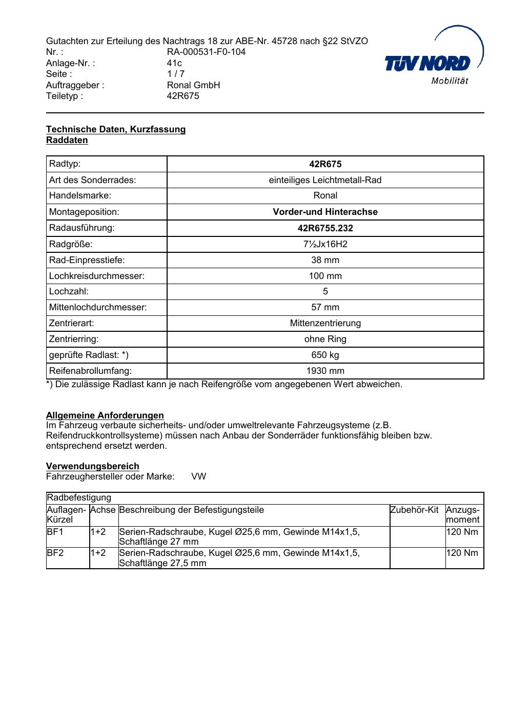 Dieses Gutachten (abe) bezieht sich auf die Alufelge Ronal 42R675 in der Ausführung ET 0, Mittenloch 0 mm (KBA 45728). Im PDF findest du typischerweise zulässige Reifengrößen, Auflagen/Anbauhinweise und – je nach Dokument – Hinweise zur Eintragung.