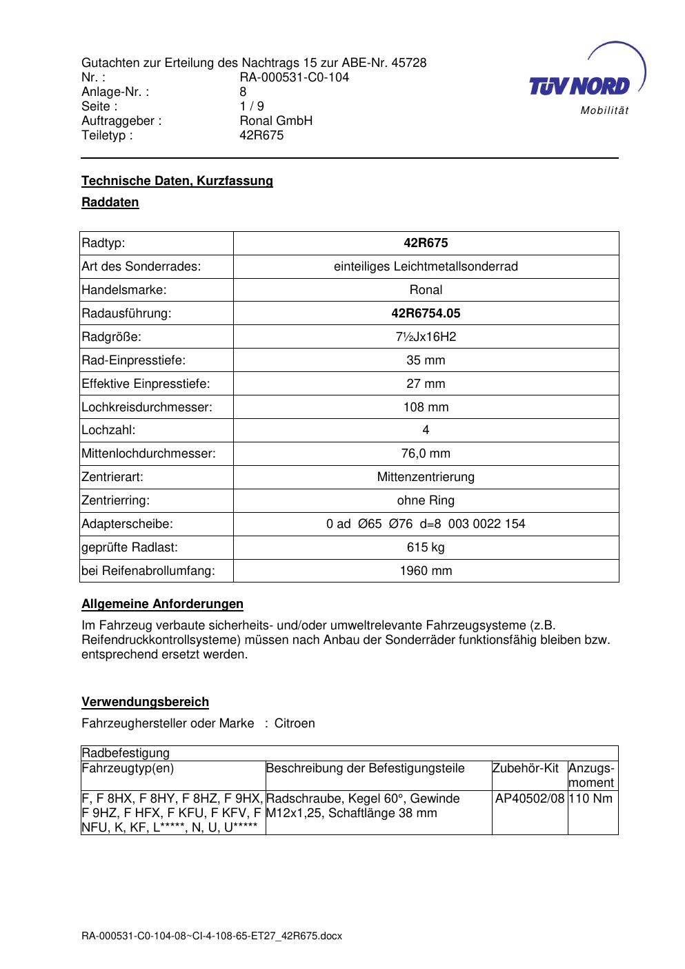 • Stimmt die KBA-Nummer auf der Felge mit diesem Dokument überein?
