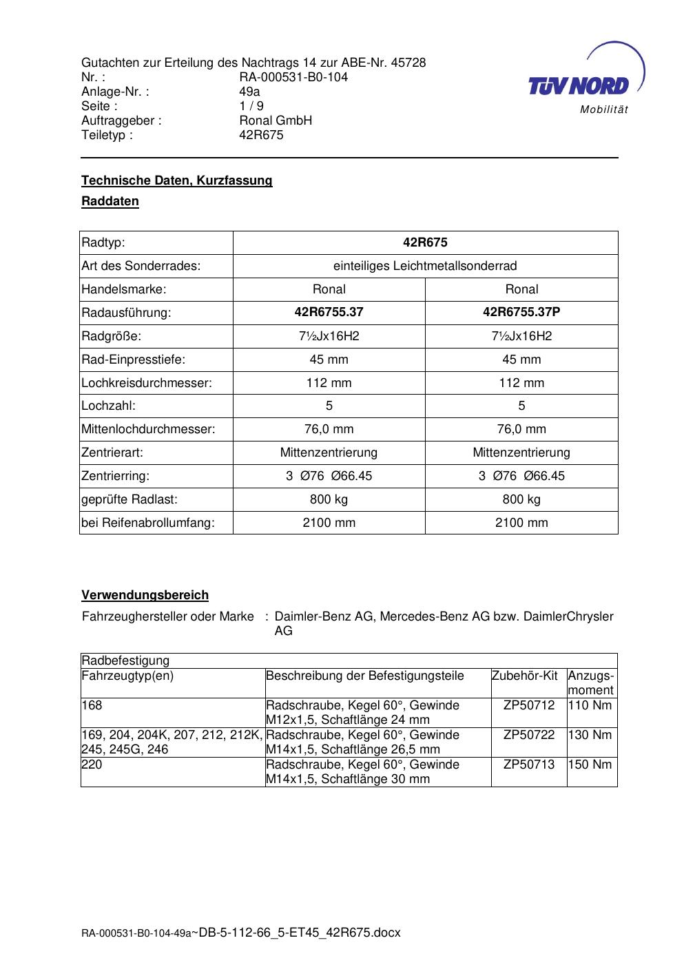 Dieses Gutachten (abe) bezieht sich auf die Alufelge Ronal 42R675 in der Ausführung ET 0, Mittenloch 0 mm (KBA 45728). Im PDF findest du typischerweise zulässige Reifengrößen, Auflagen/Anbauhinweise und – je nach Dokument – Hinweise zur Eintragung.