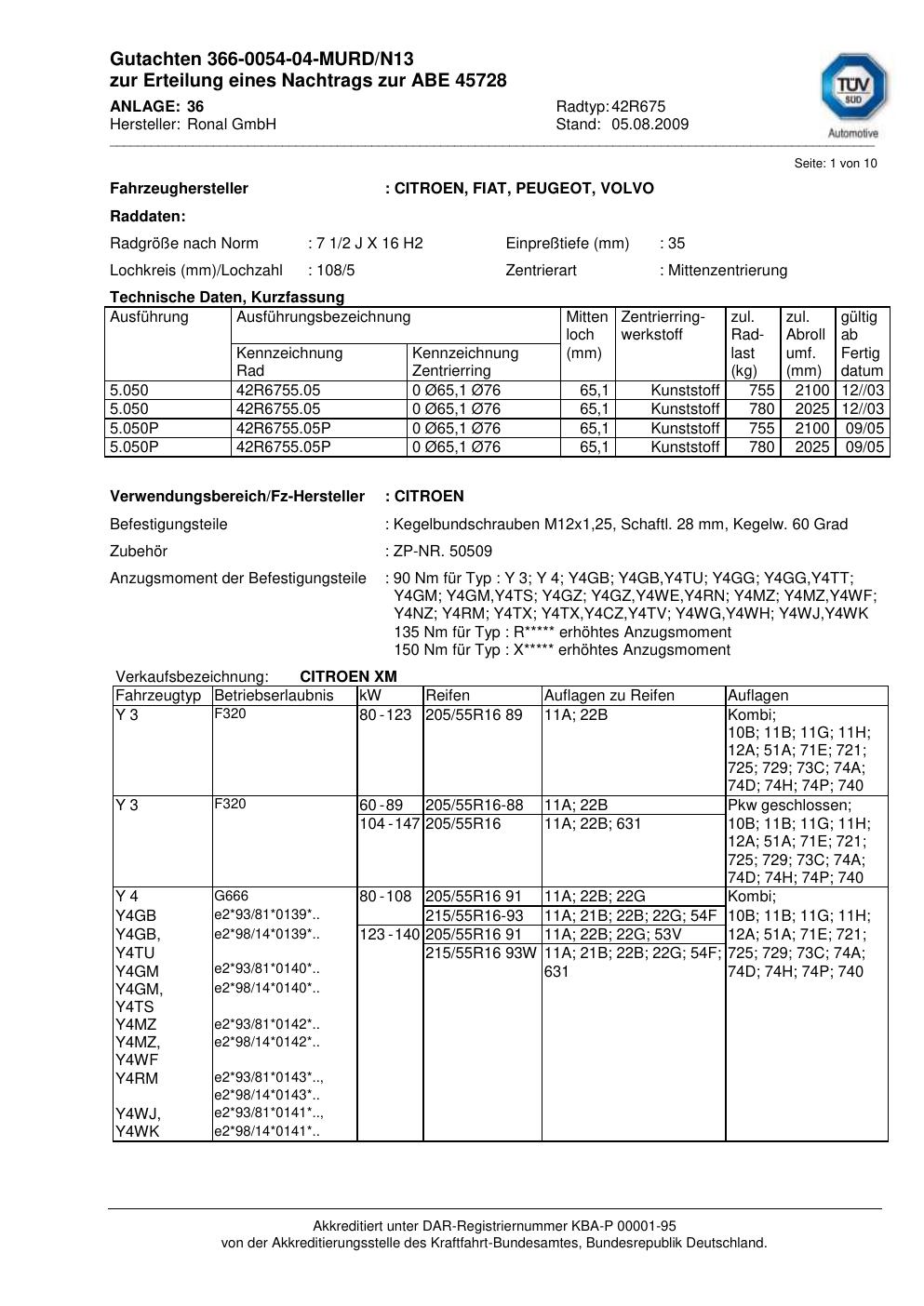 Dieses Gutachten (abe) bezieht sich auf die Alufelge Ronal 42R675 in der Ausführung 2Jx16 ET 0, Mittenloch 0 mm (KBA 45728). Im PDF findest du typischerweise zulässige Reifengrößen, Auflagen/Anbauhinweise und – je nach Dokument – Hinweise zur Eintragung.