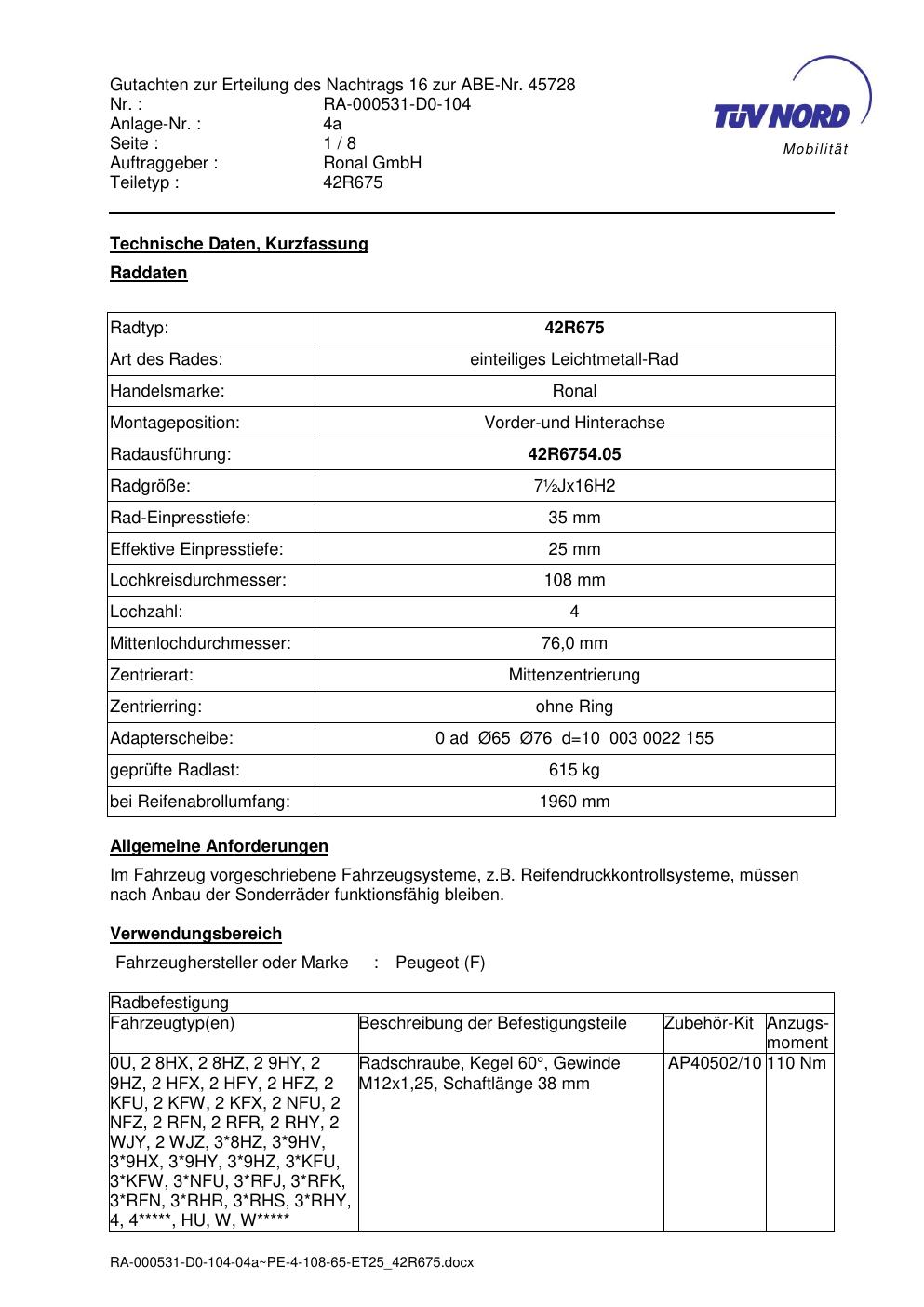 Dieses Gutachten (abe) bezieht sich auf die Alufelge Ronal 42R675 in der Ausführung ET 0, Mittenloch 0 mm (KBA 45728). Im PDF findest du typischerweise zulässige Reifengrößen, Auflagen/Anbauhinweise und – je nach Dokument – Hinweise zur Eintragung.