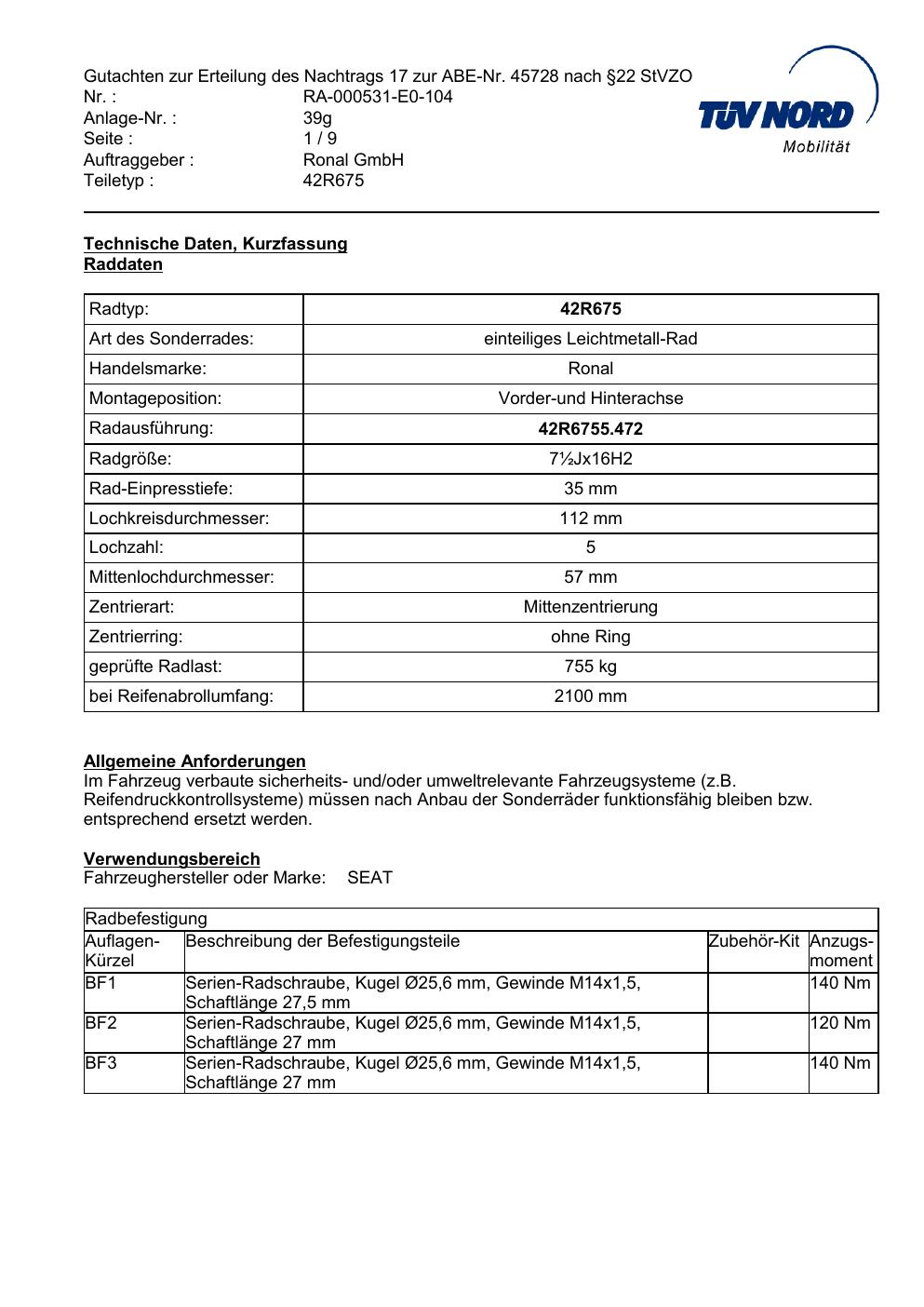Dieses Gutachten (abe) bezieht sich auf die Alufelge Ronal 42R675 in der Ausführung ET 0, Mittenloch 0 mm (KBA 45728). Im PDF findest du typischerweise zulässige Reifengrößen, Auflagen/Anbauhinweise und – je nach Dokument – Hinweise zur Eintragung.