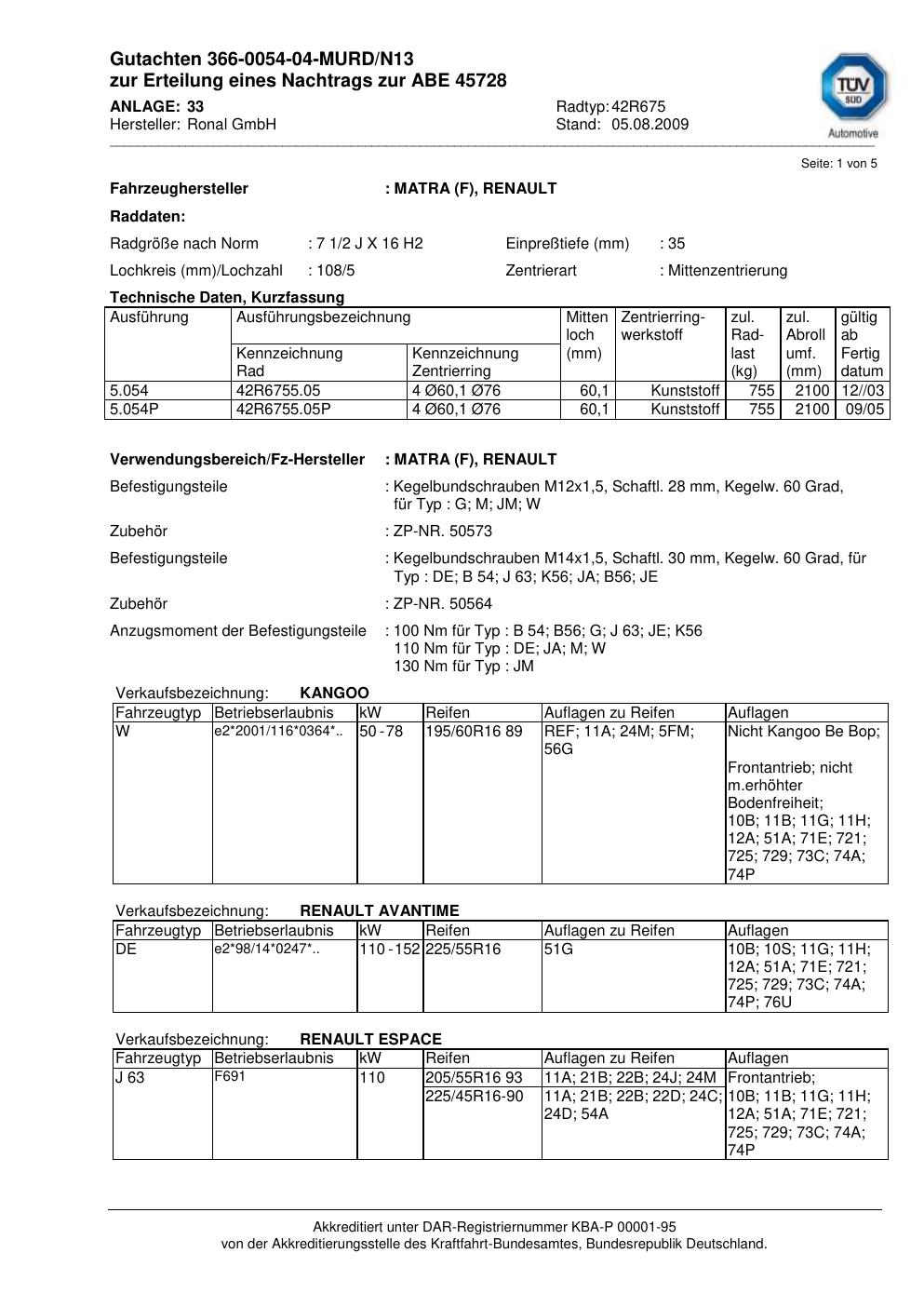 Dieses Gutachten (abe) bezieht sich auf die Alufelge Ronal 42R675 in der Ausführung 2Jx16 ET 0, Mittenloch 0 mm (KBA 45728). Im PDF findest du typischerweise zulässige Reifengrößen, Auflagen/Anbauhinweise und – je nach Dokument – Hinweise zur Eintragung.