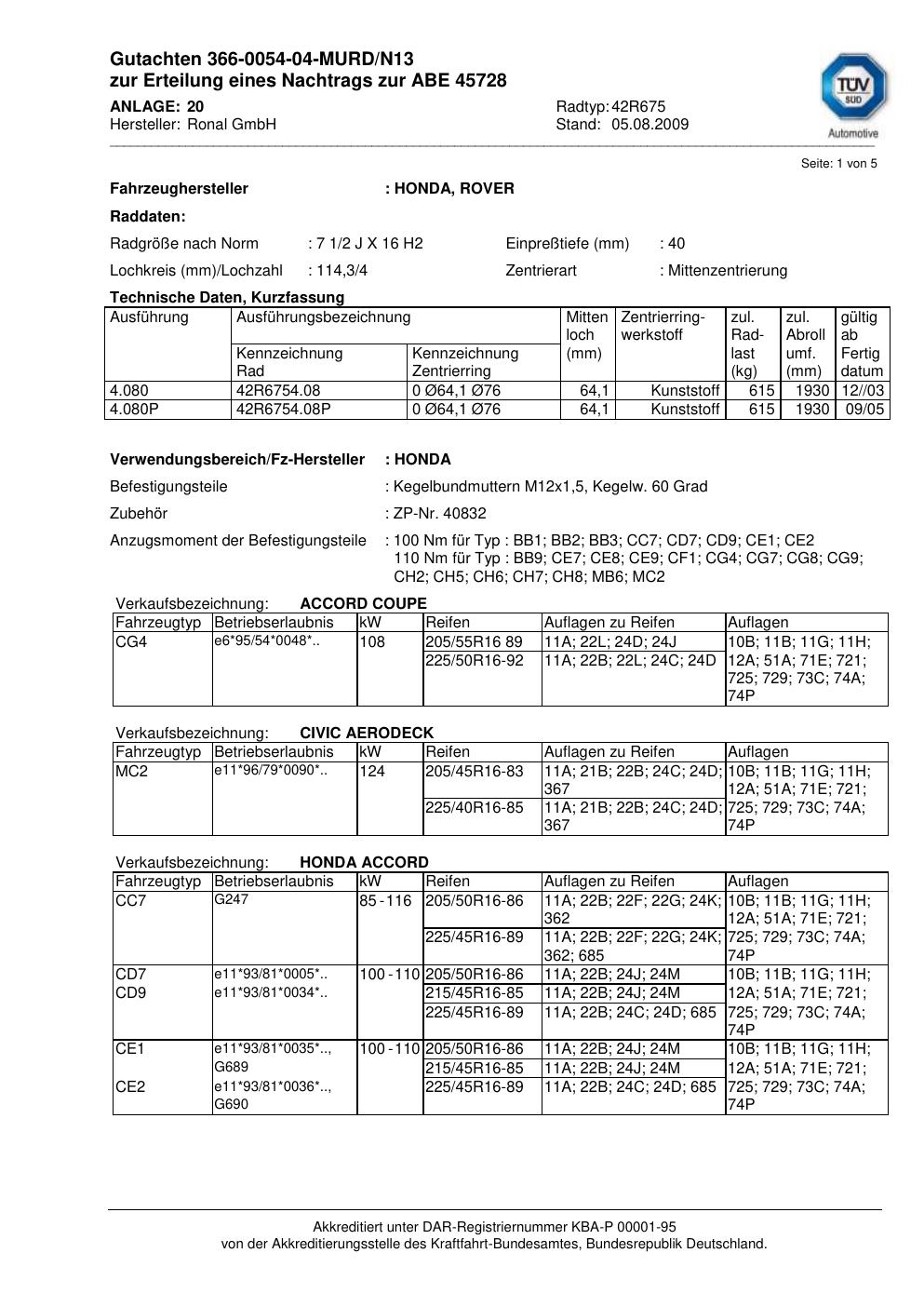 Dieses Gutachten (abe) bezieht sich auf die Alufelge Ronal 42R675 in der Ausführung 2Jx16 ET 0, Mittenloch 0 mm (KBA 45728). Im PDF findest du typischerweise zulässige Reifengrößen, Auflagen/Anbauhinweise und – je nach Dokument – Hinweise zur Eintragung.