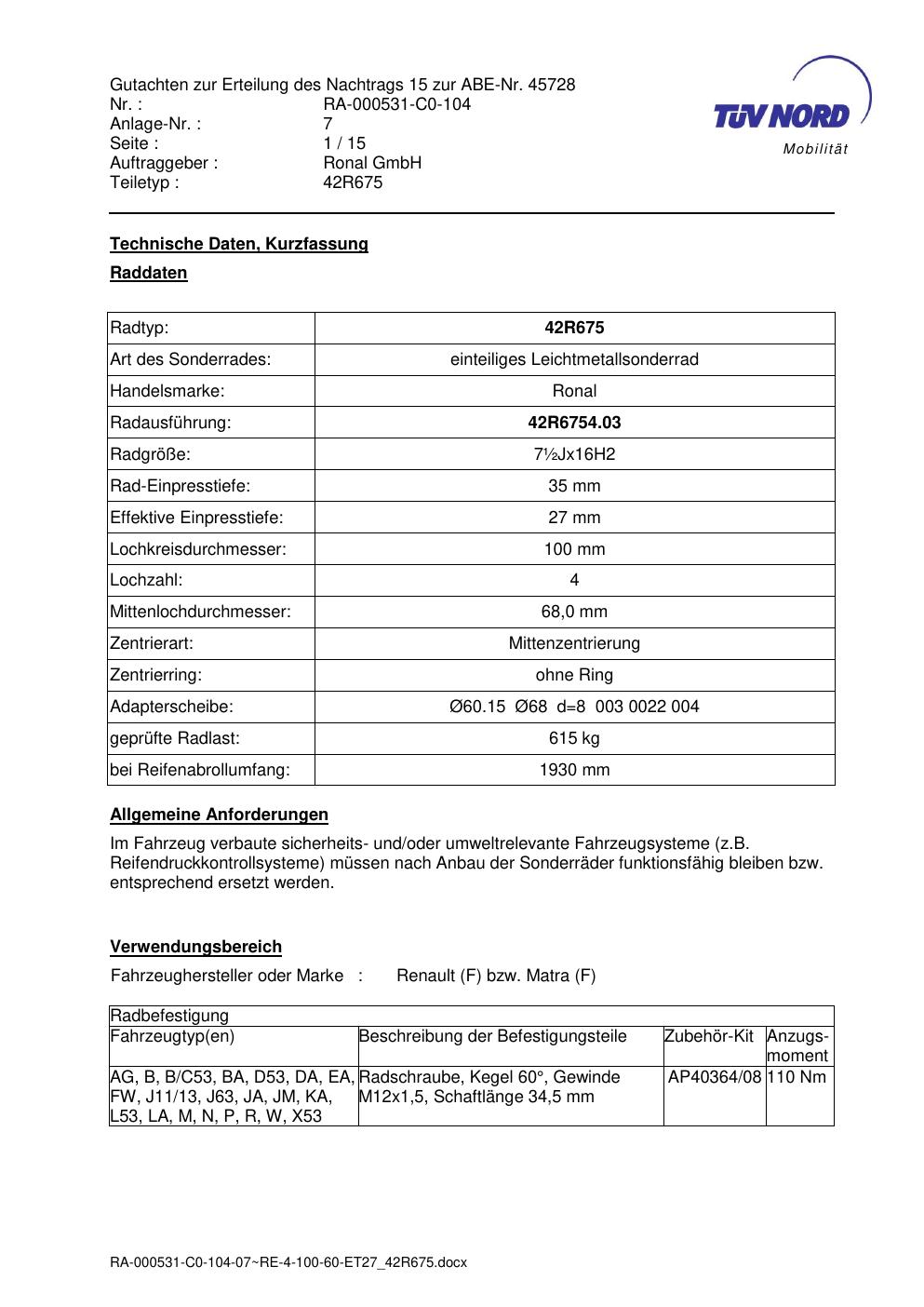 • Stimmt die KBA-Nummer auf der Felge mit diesem Dokument überein?