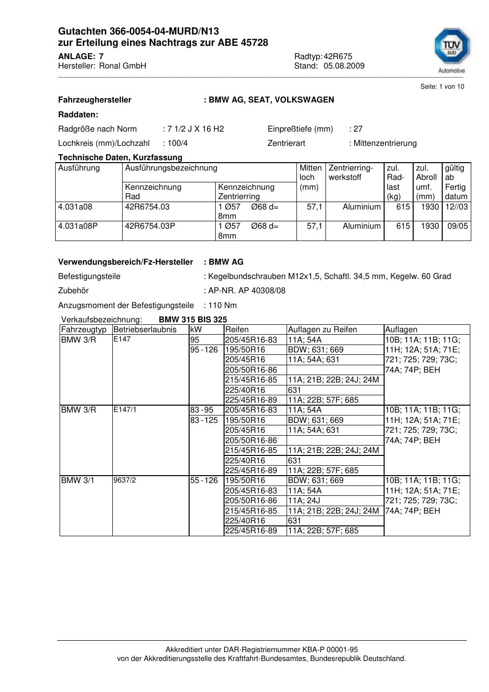 • Stimmt die KBA-Nummer auf der Felge mit diesem Dokument überein?