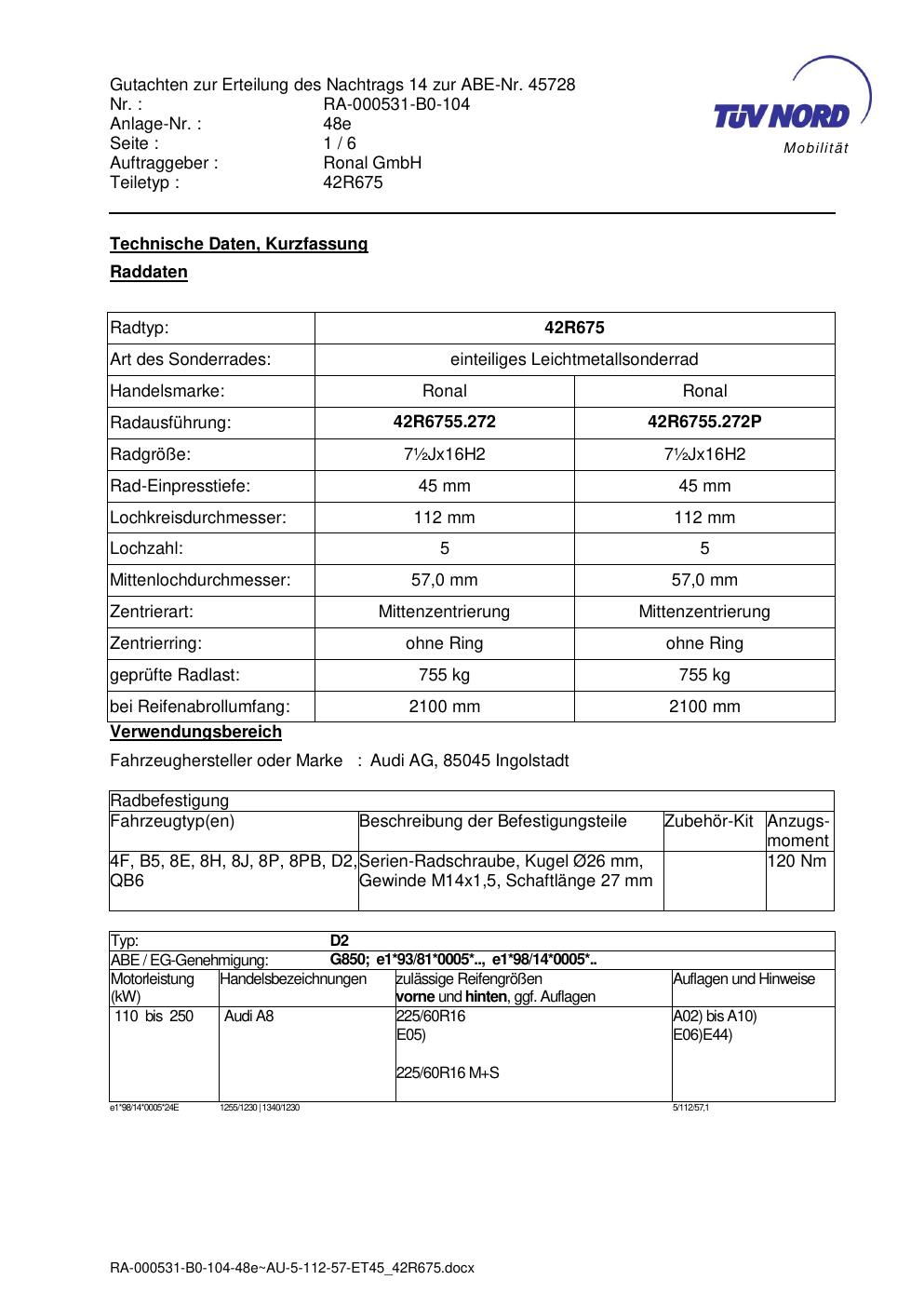 Dieses Gutachten (abe) bezieht sich auf die Alufelge Ronal 42R675 in der Ausführung ET 0, Mittenloch 0 mm (KBA 45728). Im PDF findest du typischerweise zulässige Reifengrößen, Auflagen/Anbauhinweise und – je nach Dokument – Hinweise zur Eintragung.