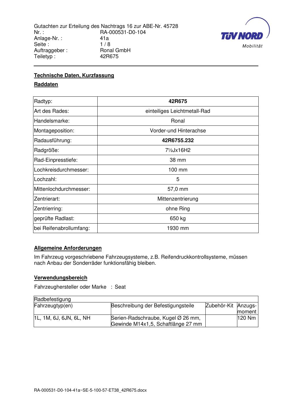 Dieses Gutachten (abe) bezieht sich auf die Alufelge Ronal 42R675 in der Ausführung ET 0, Mittenloch 0 mm (KBA 45728). Im PDF findest du typischerweise zulässige Reifengrößen, Auflagen/Anbauhinweise und – je nach Dokument – Hinweise zur Eintragung.