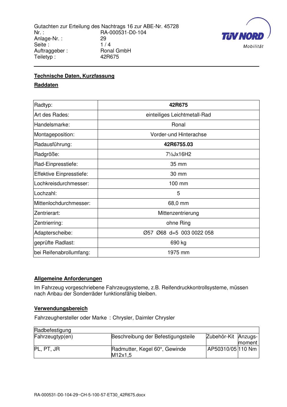 • Stimmt die KBA-Nummer auf der Felge mit diesem Dokument überein?