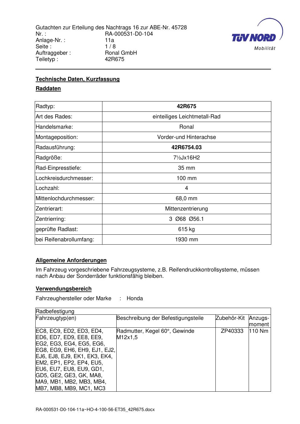 • Stimmt die KBA-Nummer auf der Felge mit diesem Dokument überein?